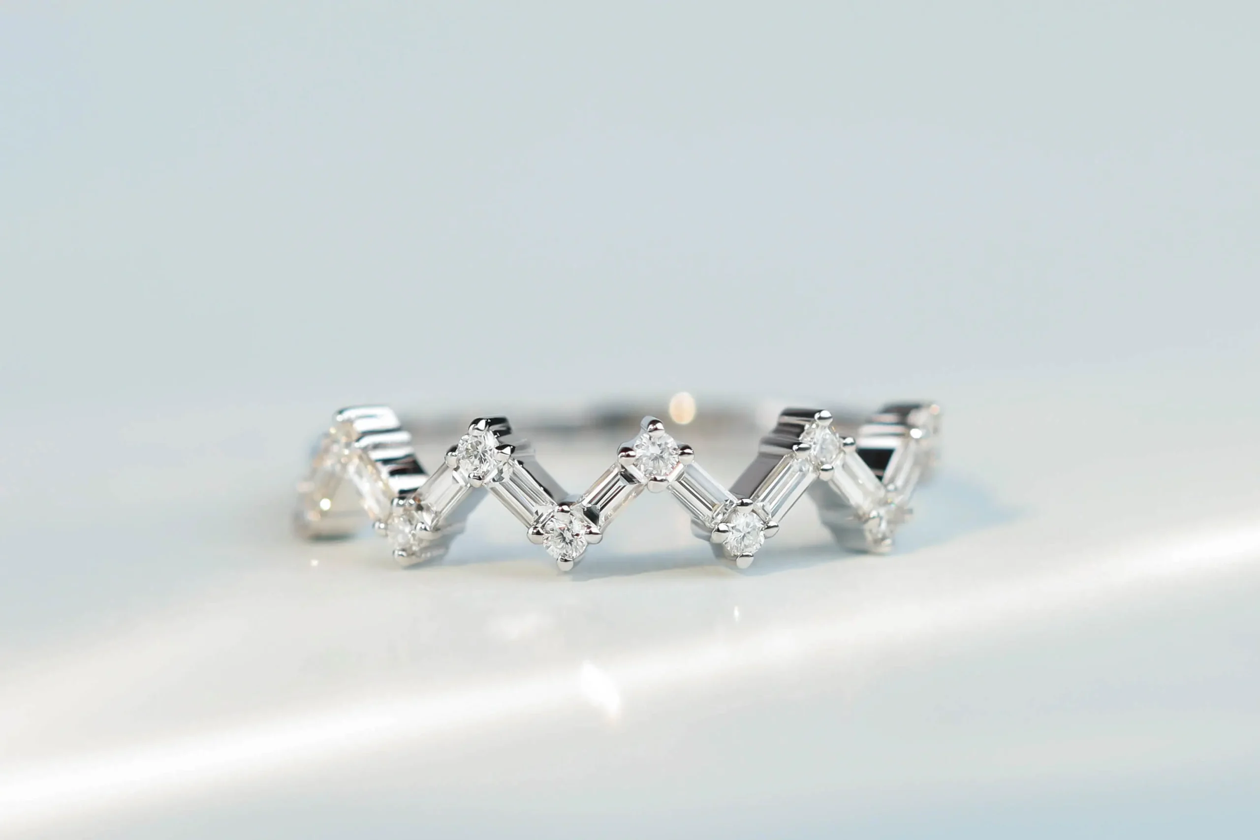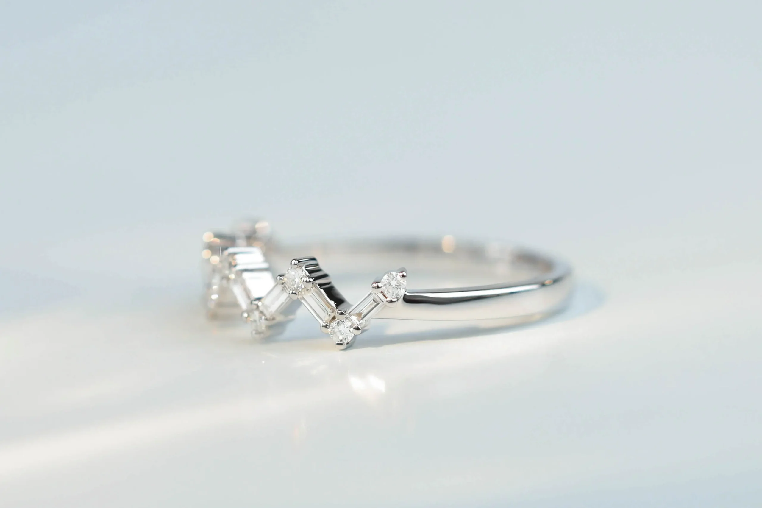 Золотое кольцо общим весом 1,97 гр с 9 бриллиантами в огранке «багет», 0,21 кт, цвет 3, чистота 5; 10 бриллиантами в огранке «круглая», 0,11 кт, цвет 3, чистота 5.