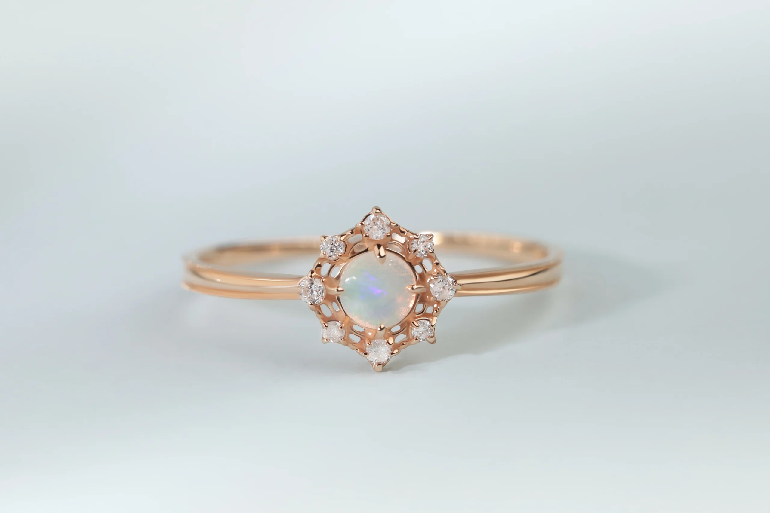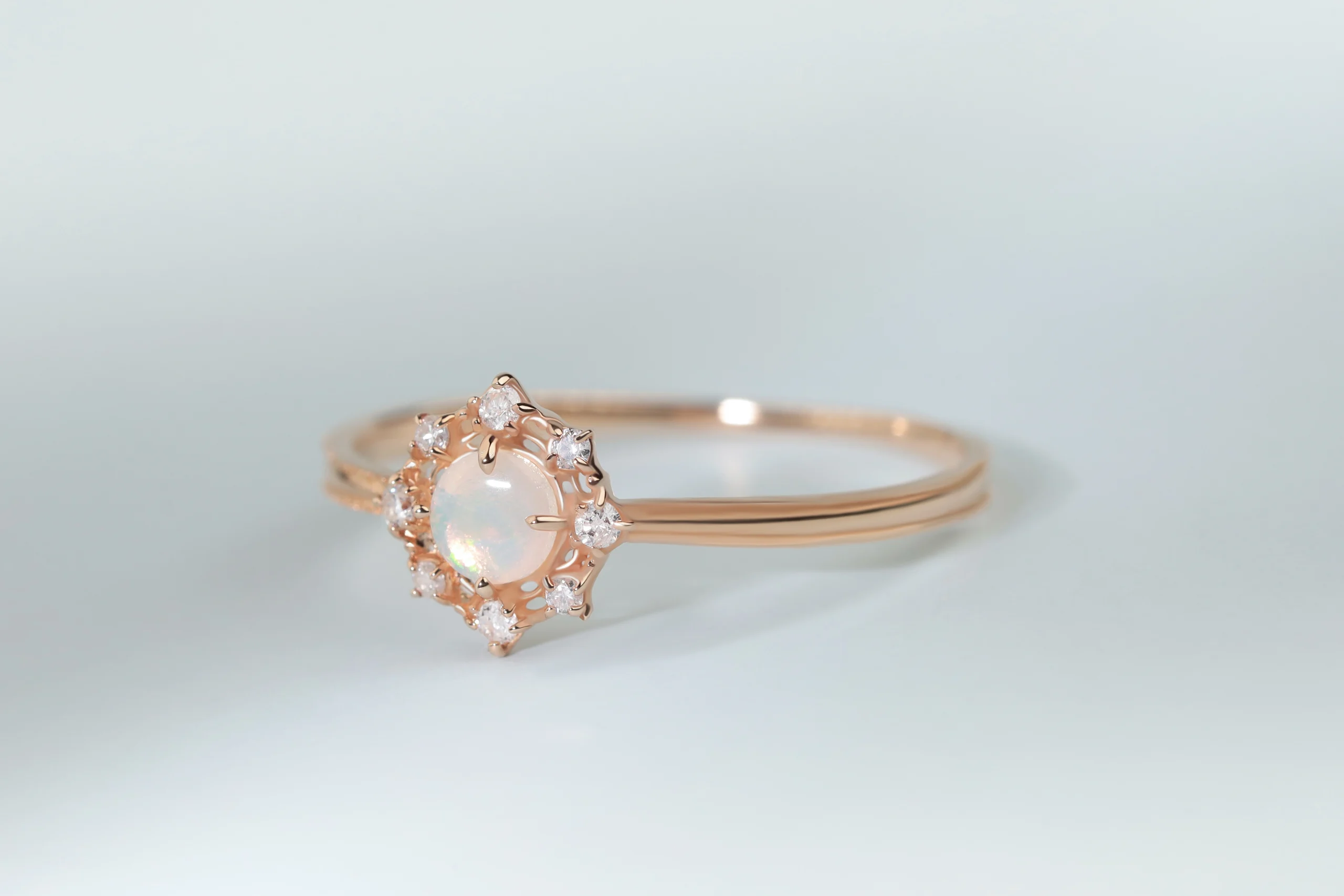 Золотое кольцо общим весом 0,625 гр с 1 опалом 0,15 кт; 8 бриллиантами в огранке «круглая», 0,05 кт, цвет 4, чистота 5. Размер центральной части 6 х 7 мм.