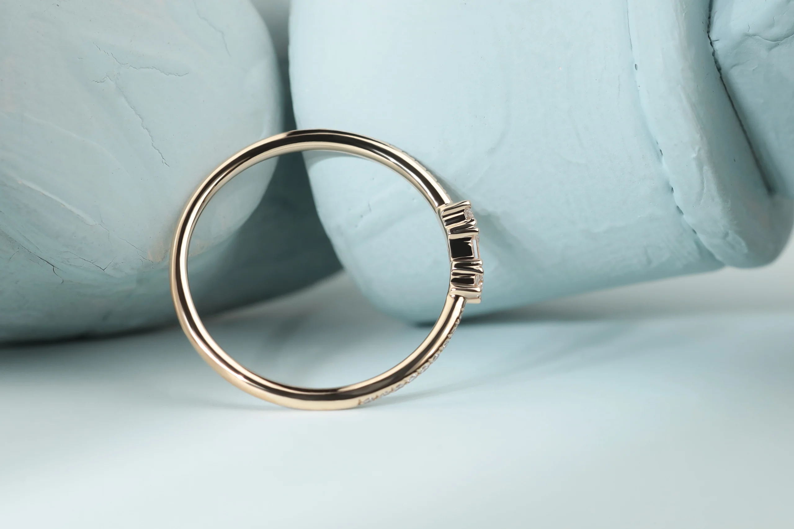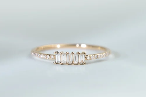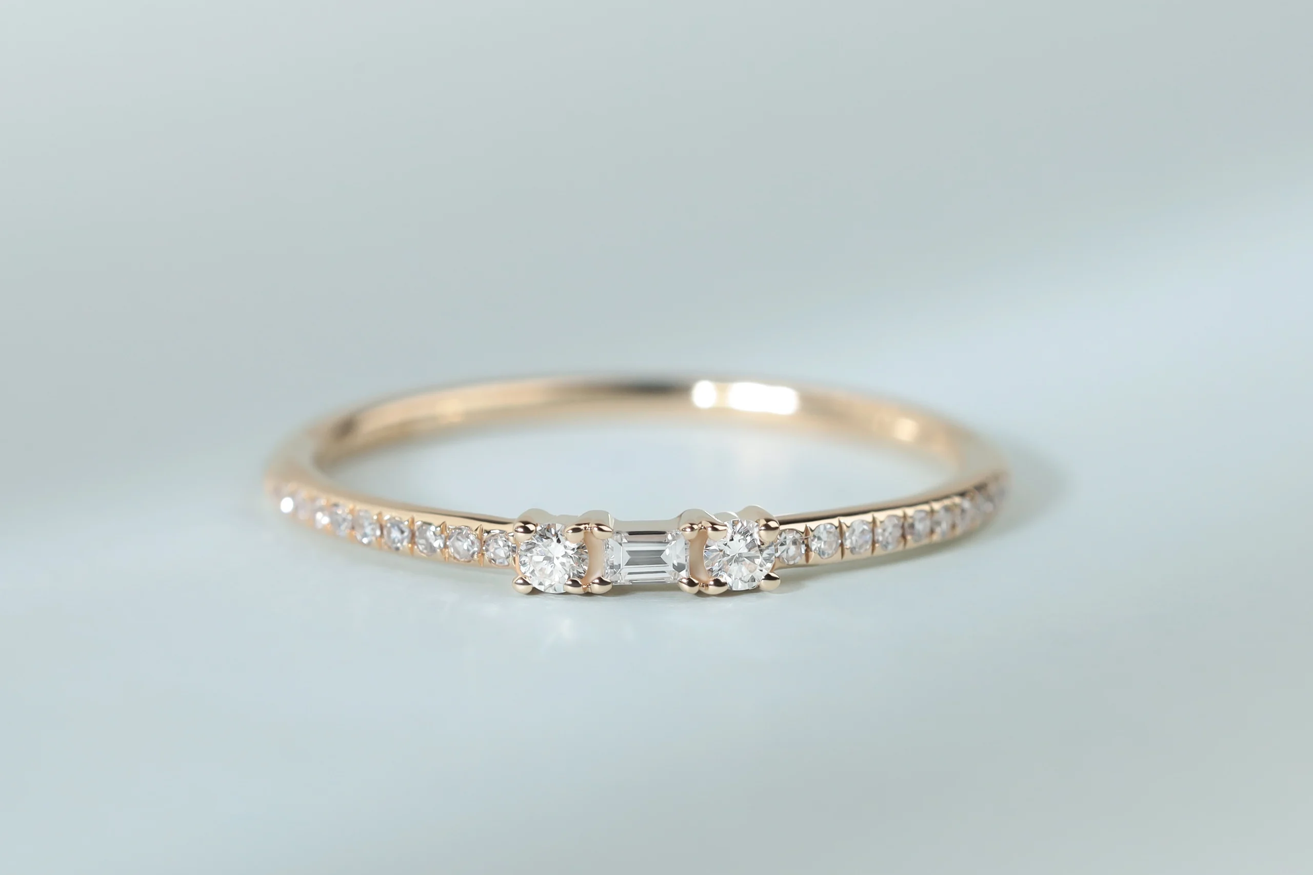 Кольцо из золота с 22 бриллиантами в огранке «круглая» весом 0,10 карат, цвет 3, чистота 5; 1 бриллиантом в огранке «багет» весом 0,03 карат, цвет 3, чистота 5.