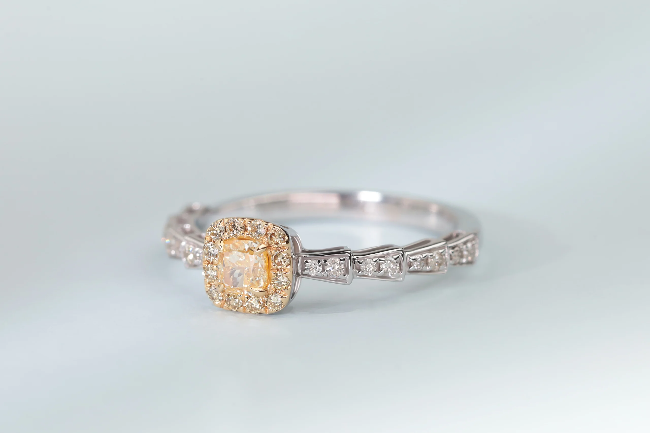 Кольцо из золота с 16 бриллиантами в огранке «круглая» весом 0,20 карат, цвет 4, чистота 5; 13 бриллиантами в огранке «круглая» весом 0,25 карат, цвет 6, чистота 5.