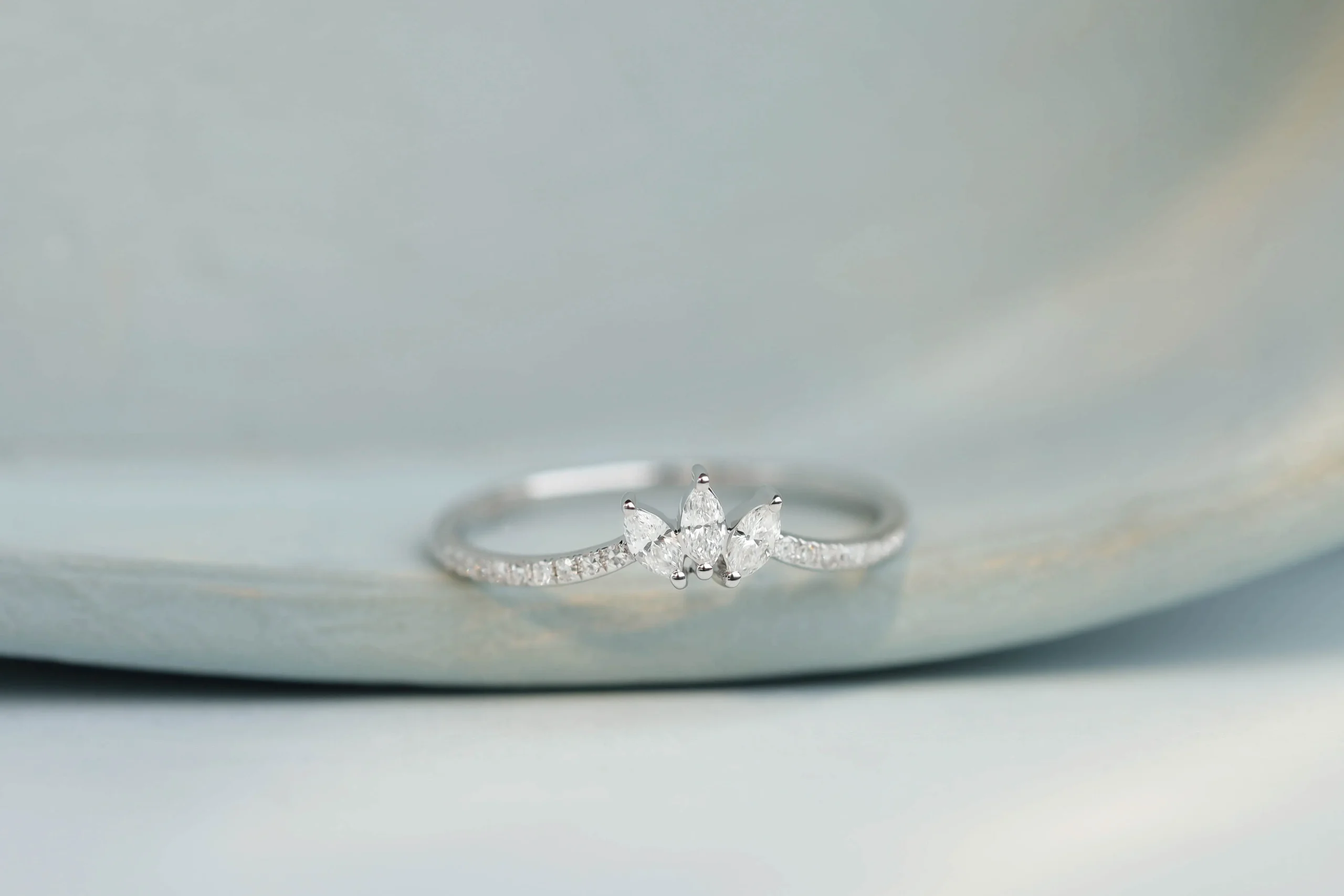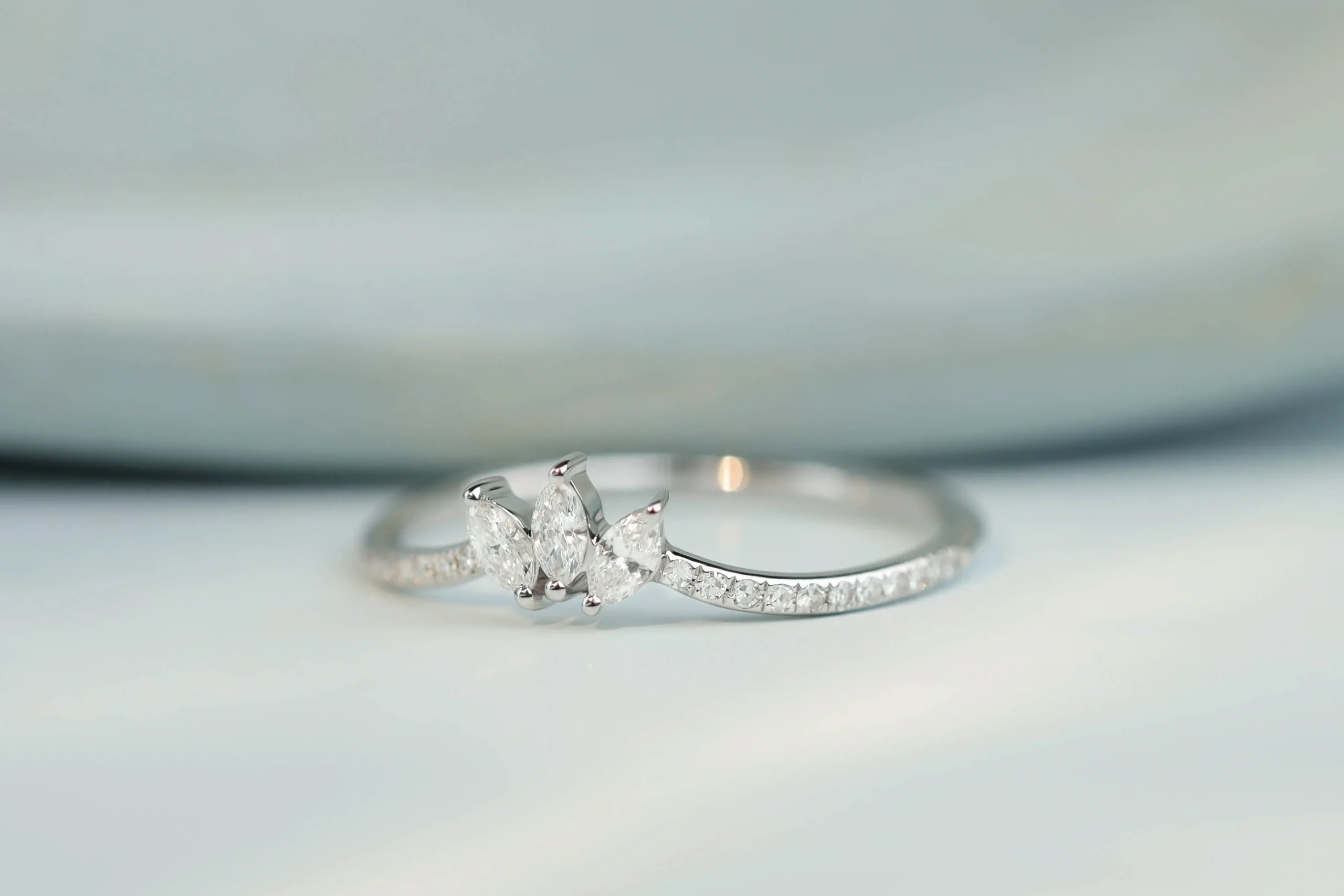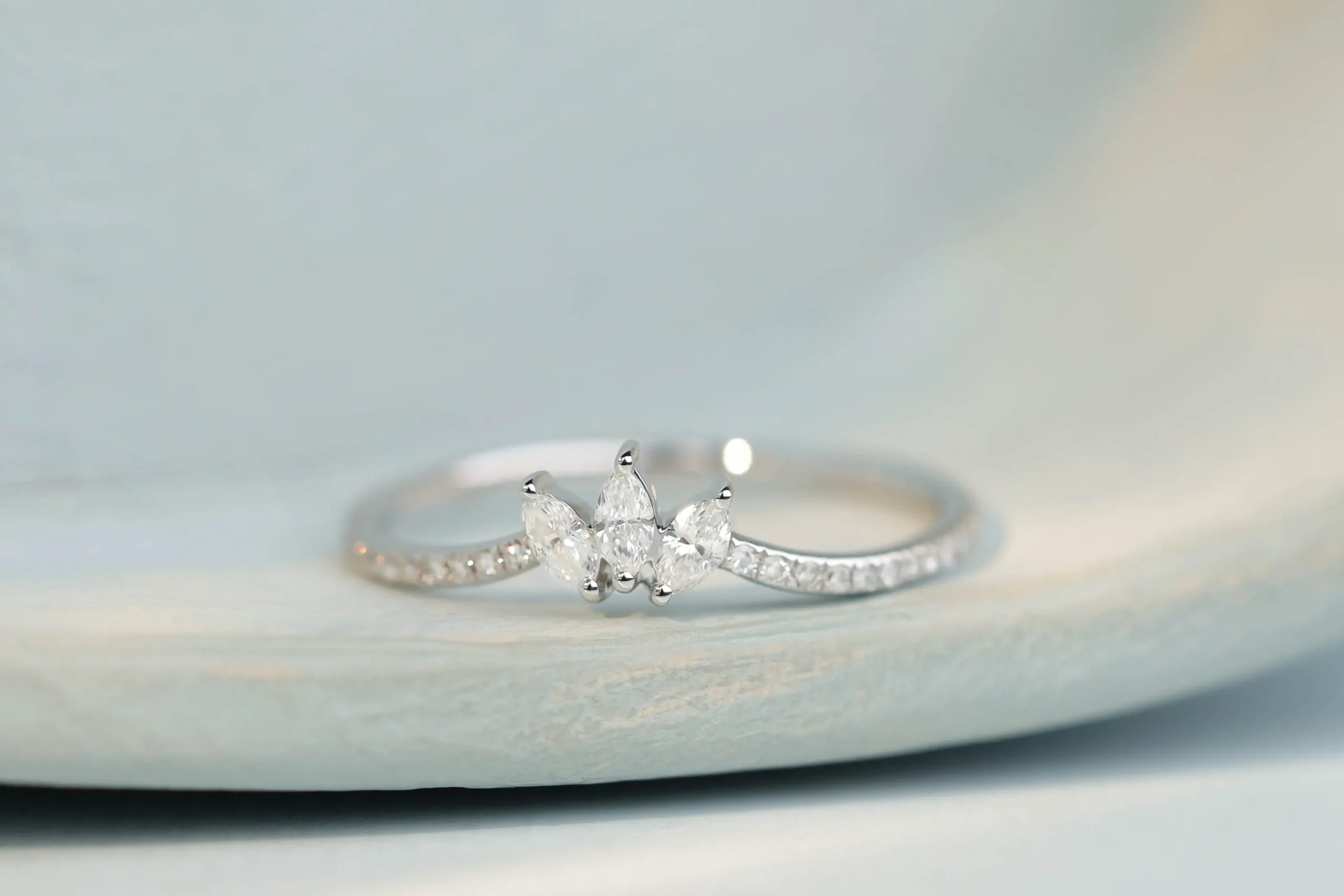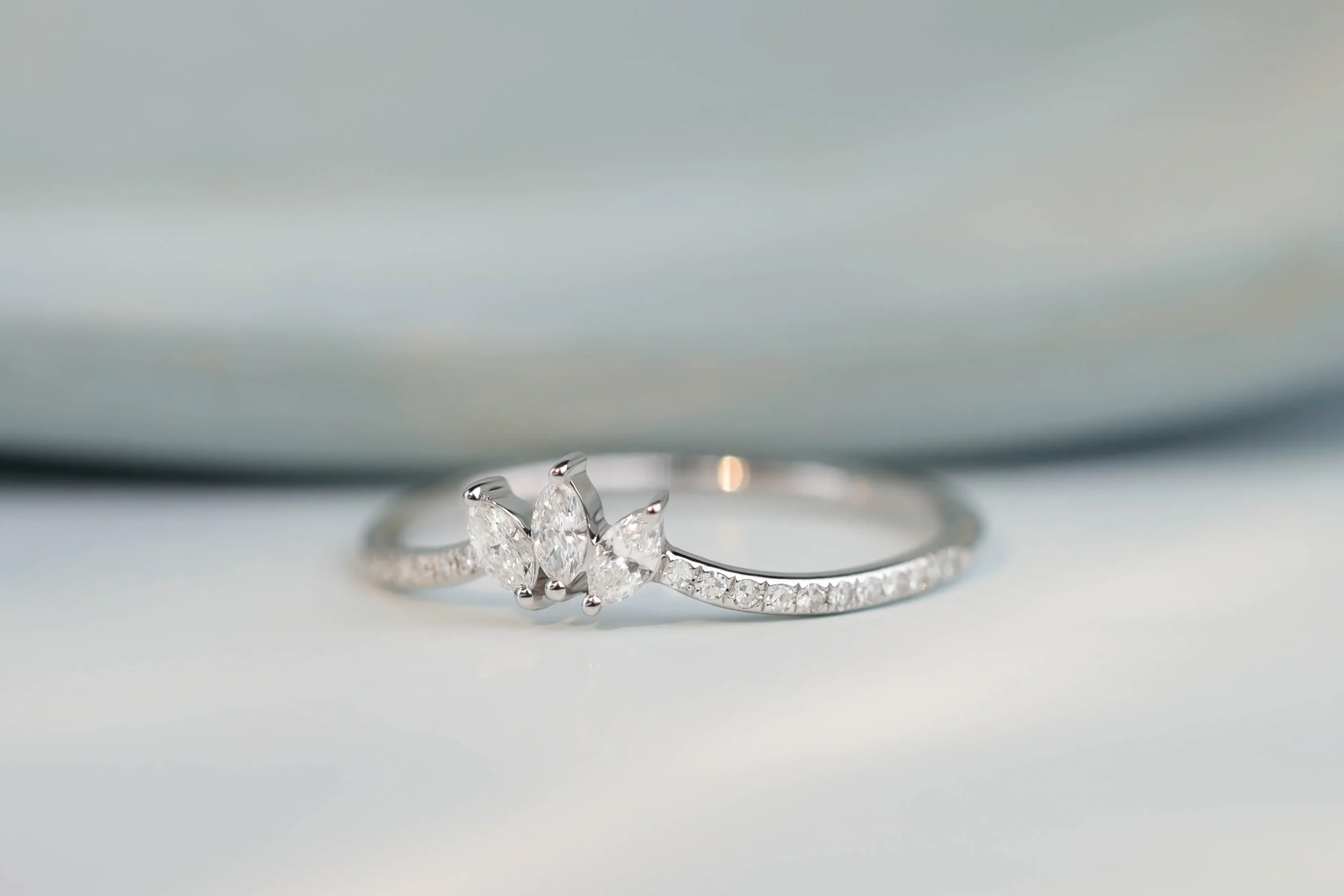 Золотое кольцо общим весом 1,01 гр с 3 бриллиантами в огранке «маркиз», 0,12 кт, цвет 3, чистота 5; 22 бриллиантами в огранке «круглая», 0,07 кт, цвет 3, чистота 5. Размер центральной части 3 х 6 мм.