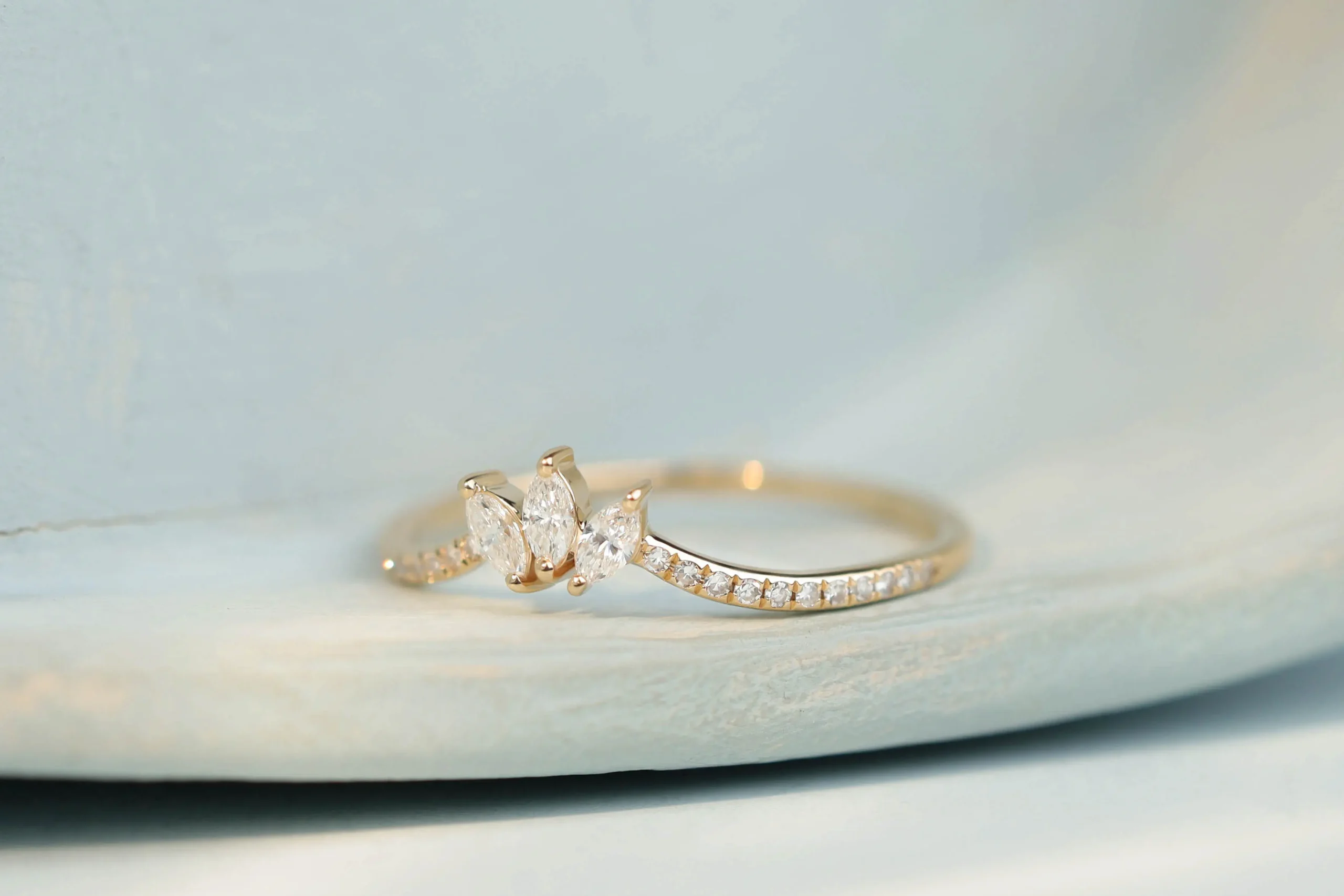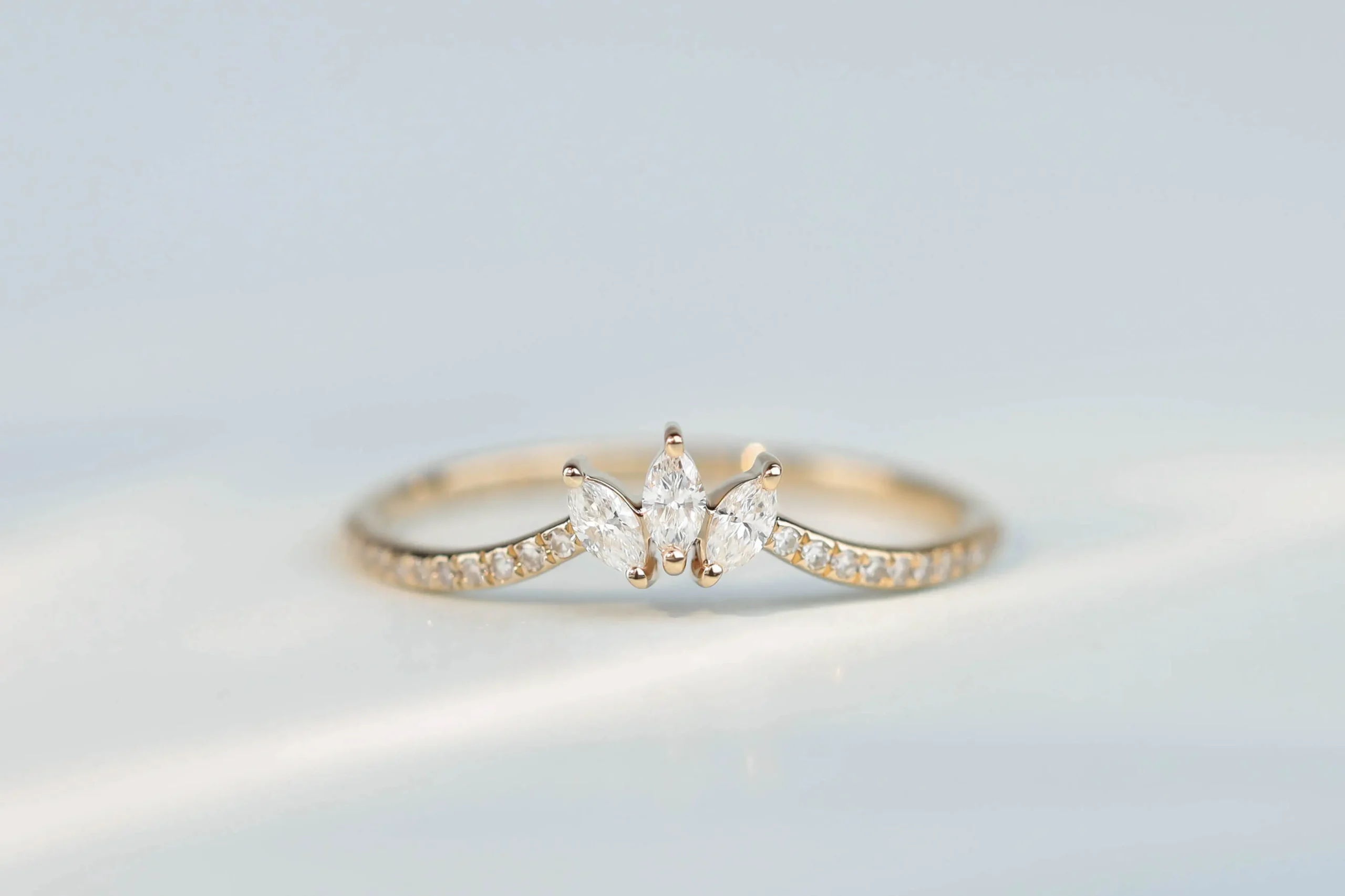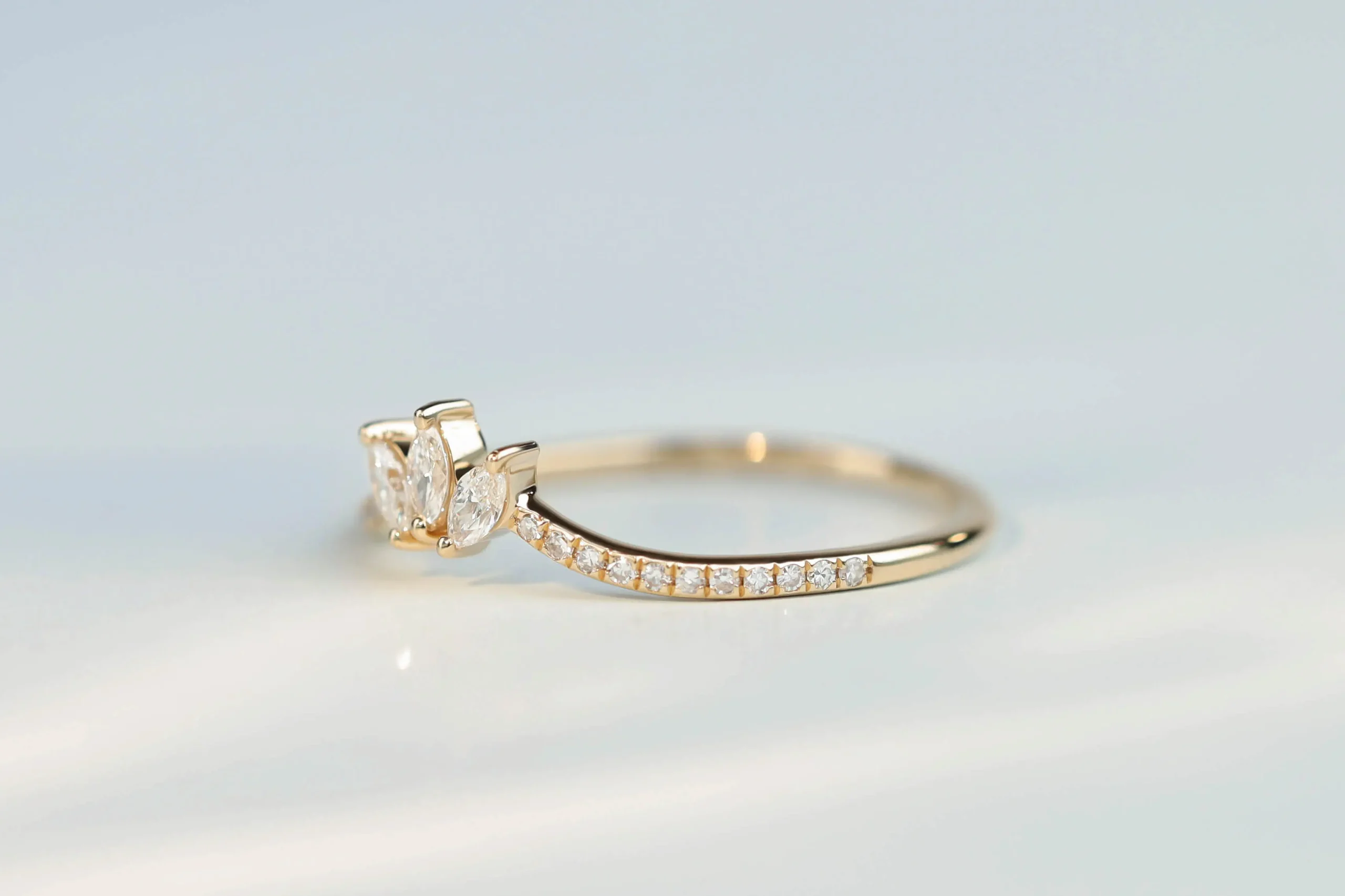 Золотое кольцо общим весом 1,07 гр с 3 бриллиантами в огранке «багет», 1,12 кт, цвет 3, чистота 5; 22 бриллиантами в огранке «круглая», 0,07 кт, цвет 3, чистота 5.