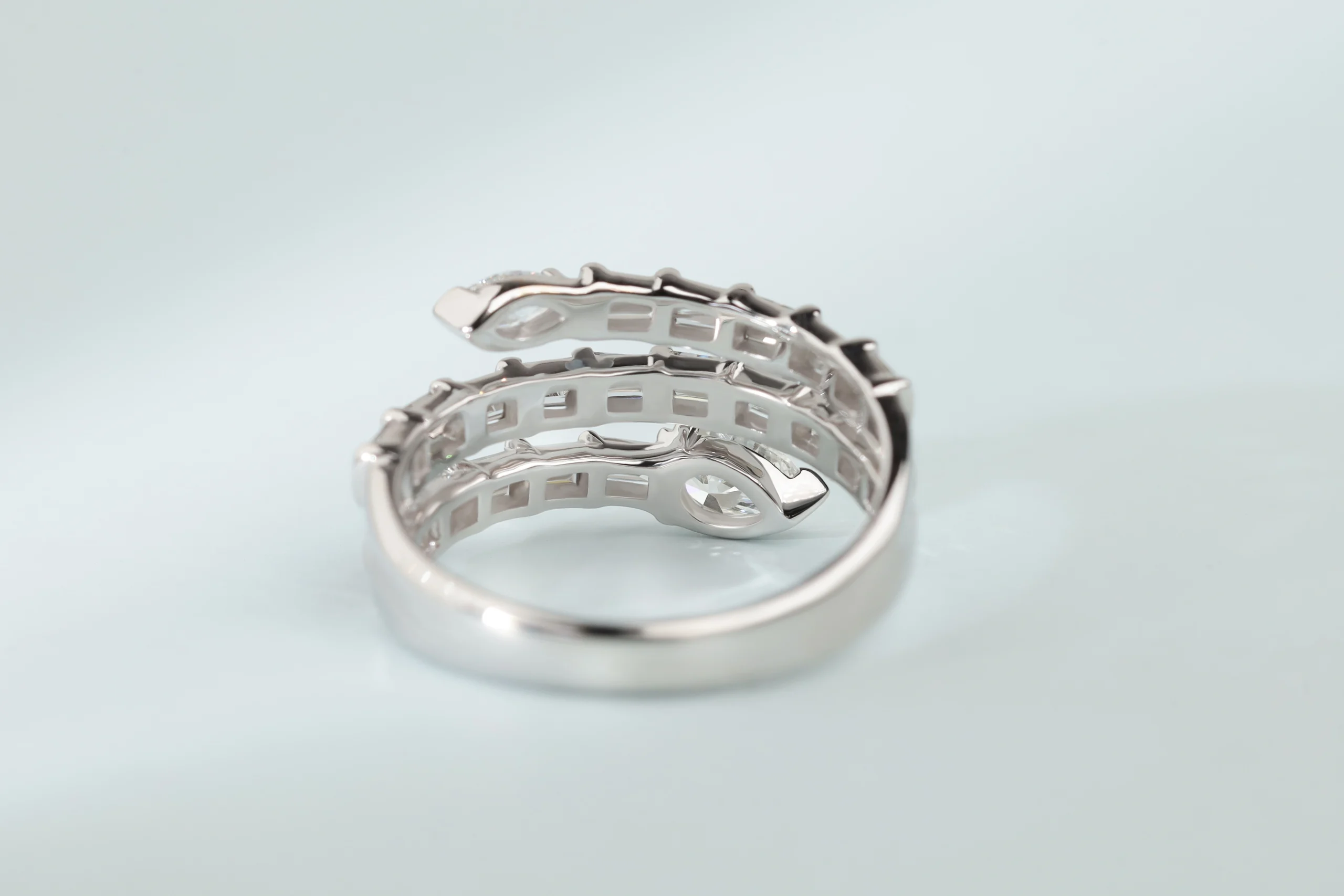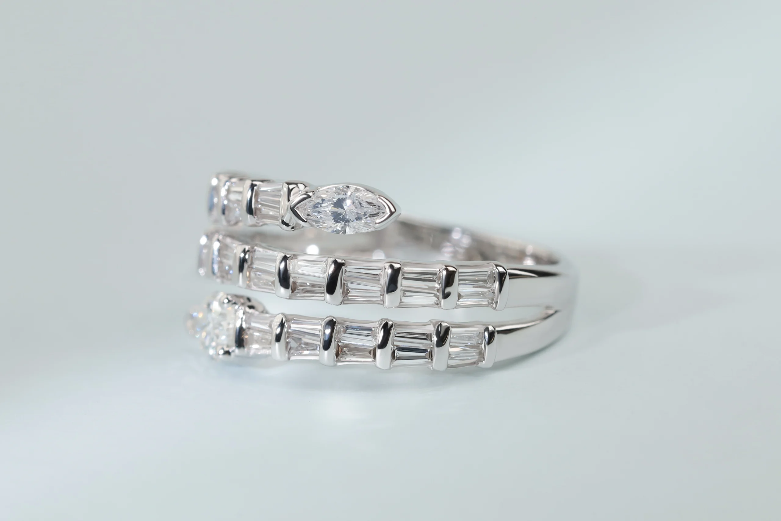Кольцо из золота с 1 бриллиантом в огранке «маркиз» весом 0,13 карат, цвет 4, чистота 5; с 1 бриллиантом в огранке «груша» весом 0,34 карат, цвет 3, чистота 5; 38 бриллиантами в огранке «багет» весом 0,60 карат.