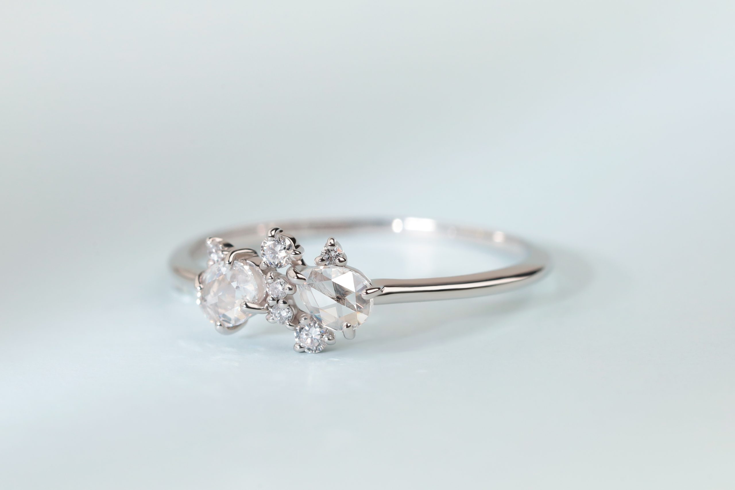 Кольцо из платины с 6 бриллиантами в огранке «круглая» весом 0,05 карат, цвет 3, чистота 5; 2 бриллиантами в огранке «роза» весом 0,17 карат, цвет 5, чистота 5.