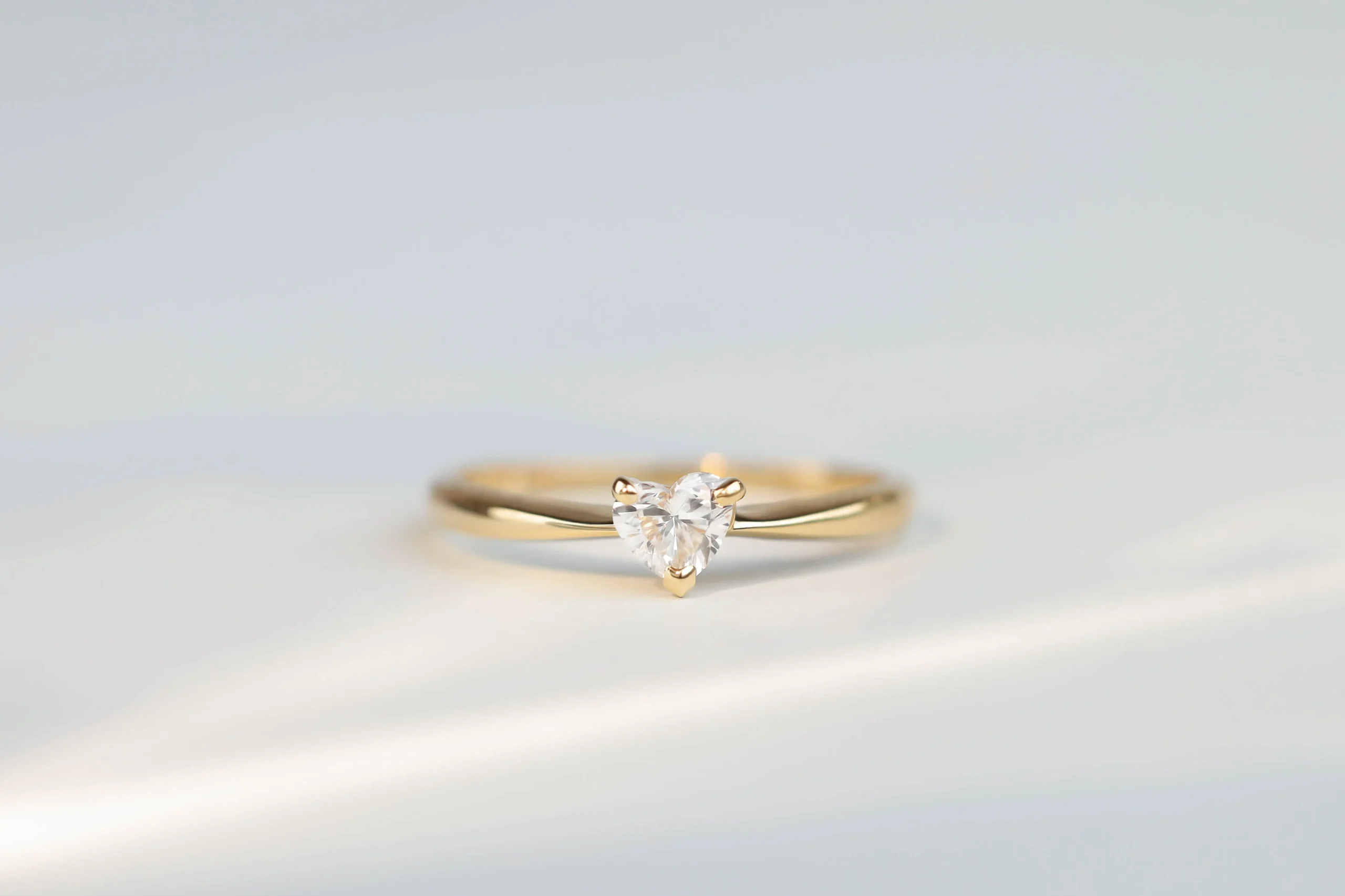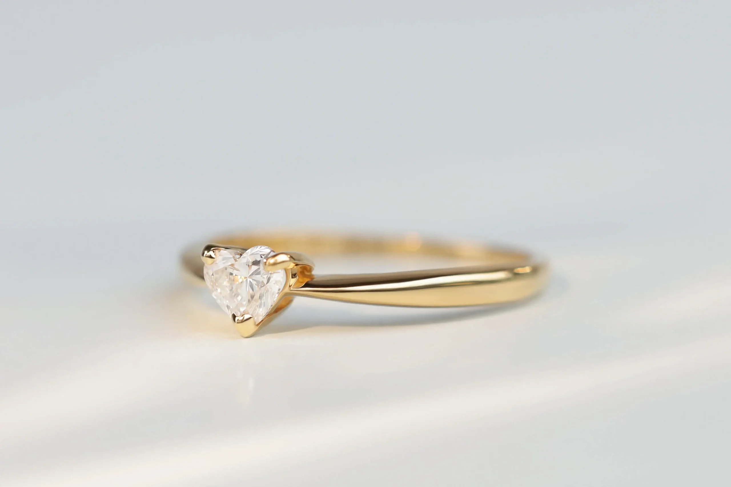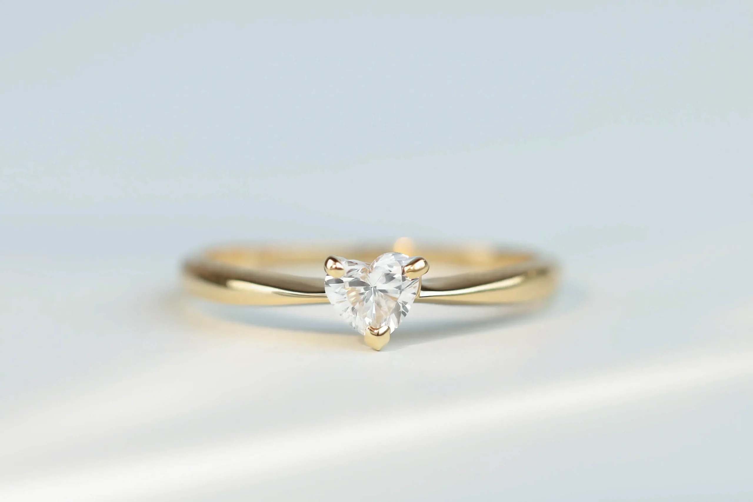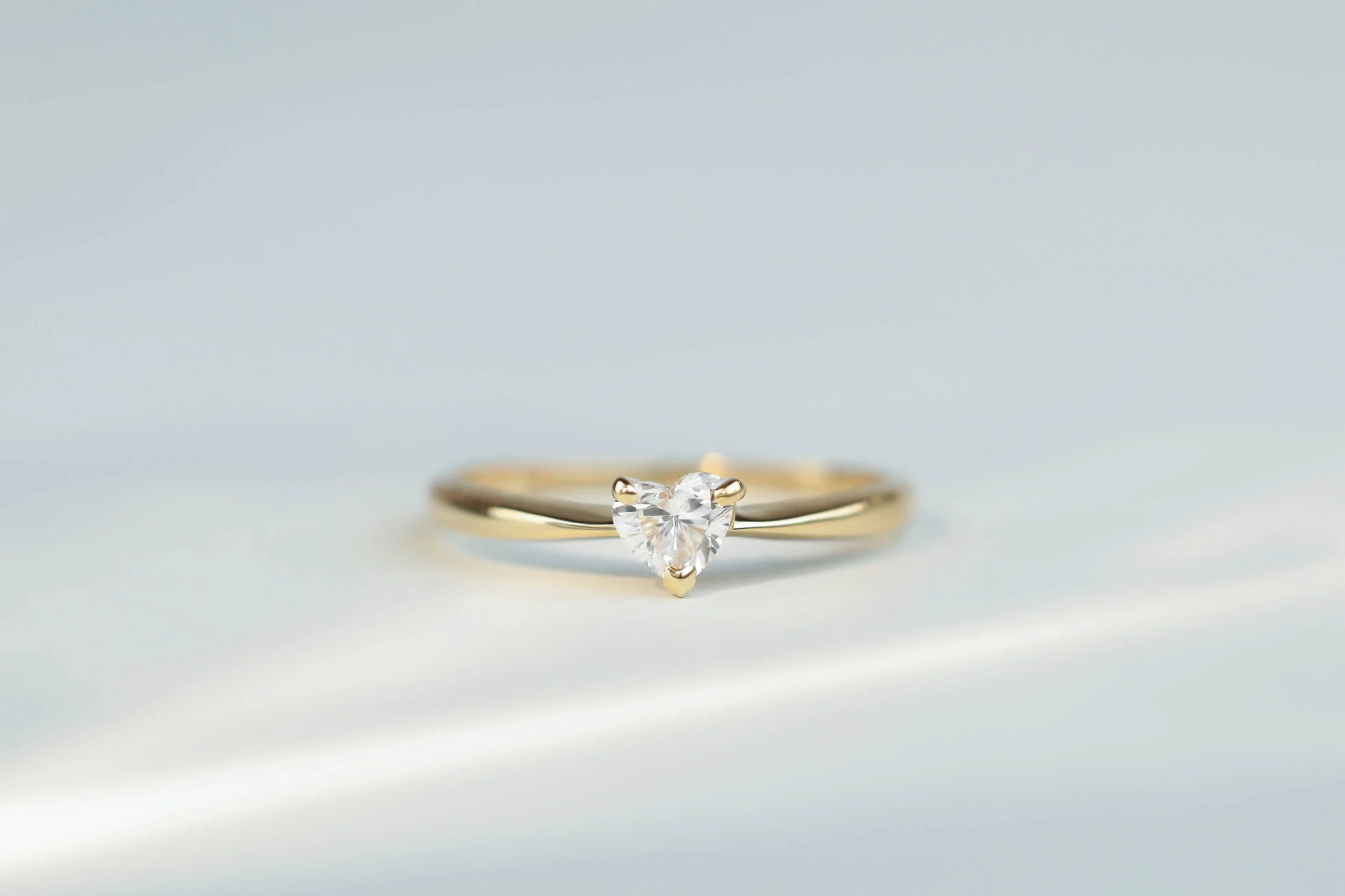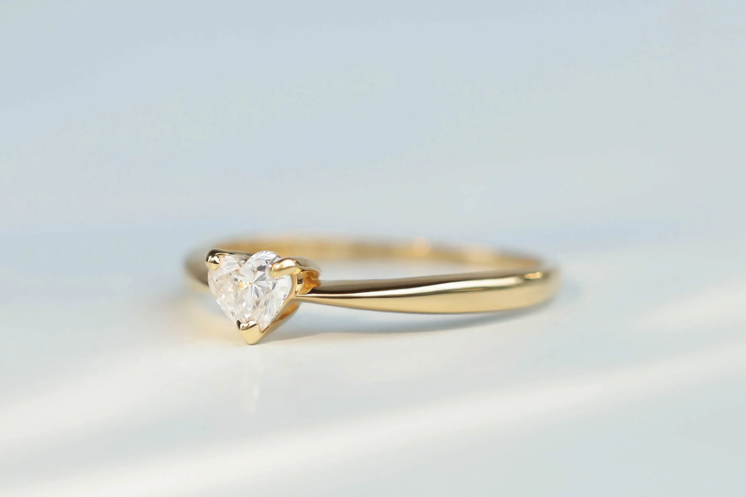 Золотое кольцо общим весом 1,4 гр с 1 бриллиантом в огранке «сердце», 0,25 кт, цвет 4, чистота 5.