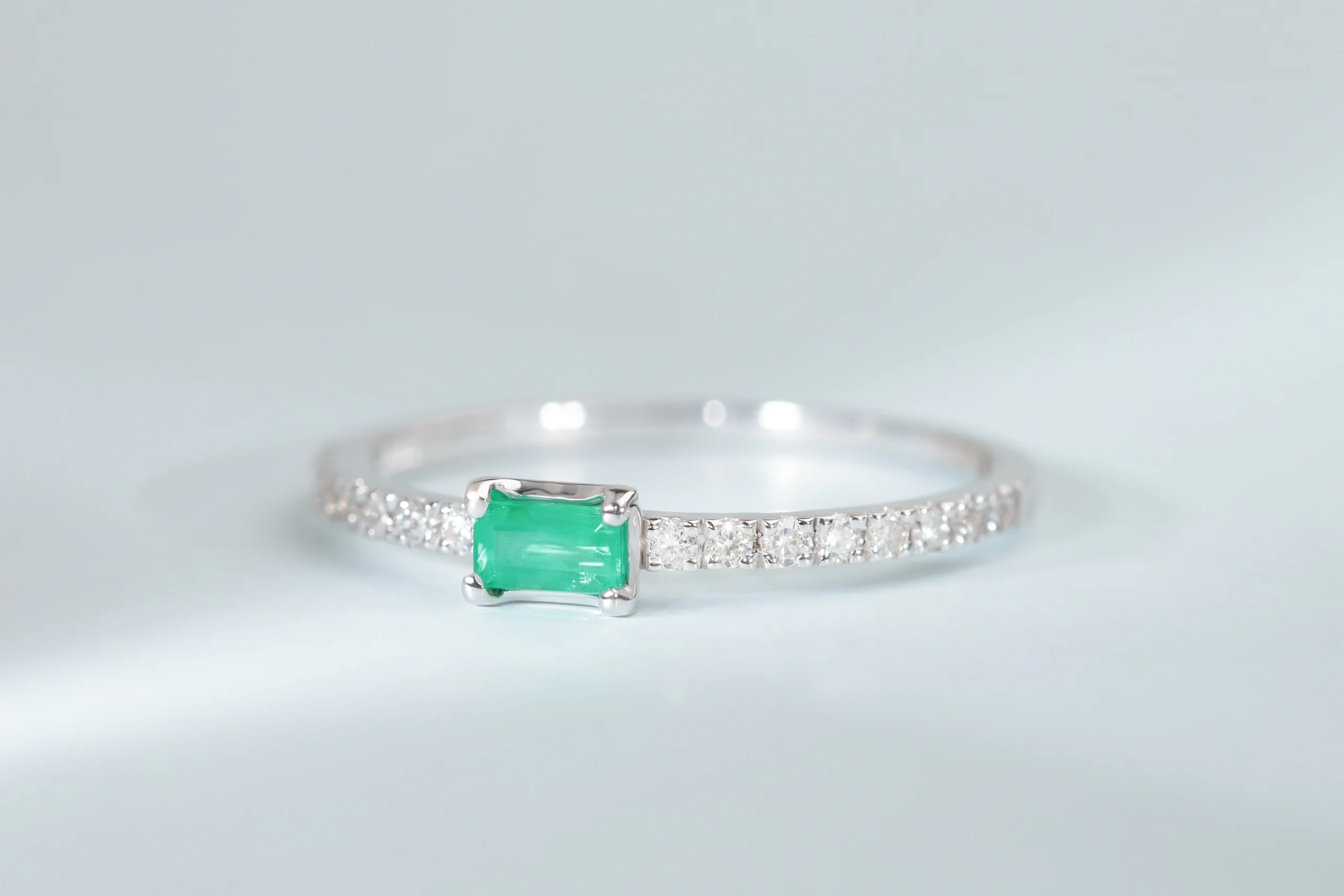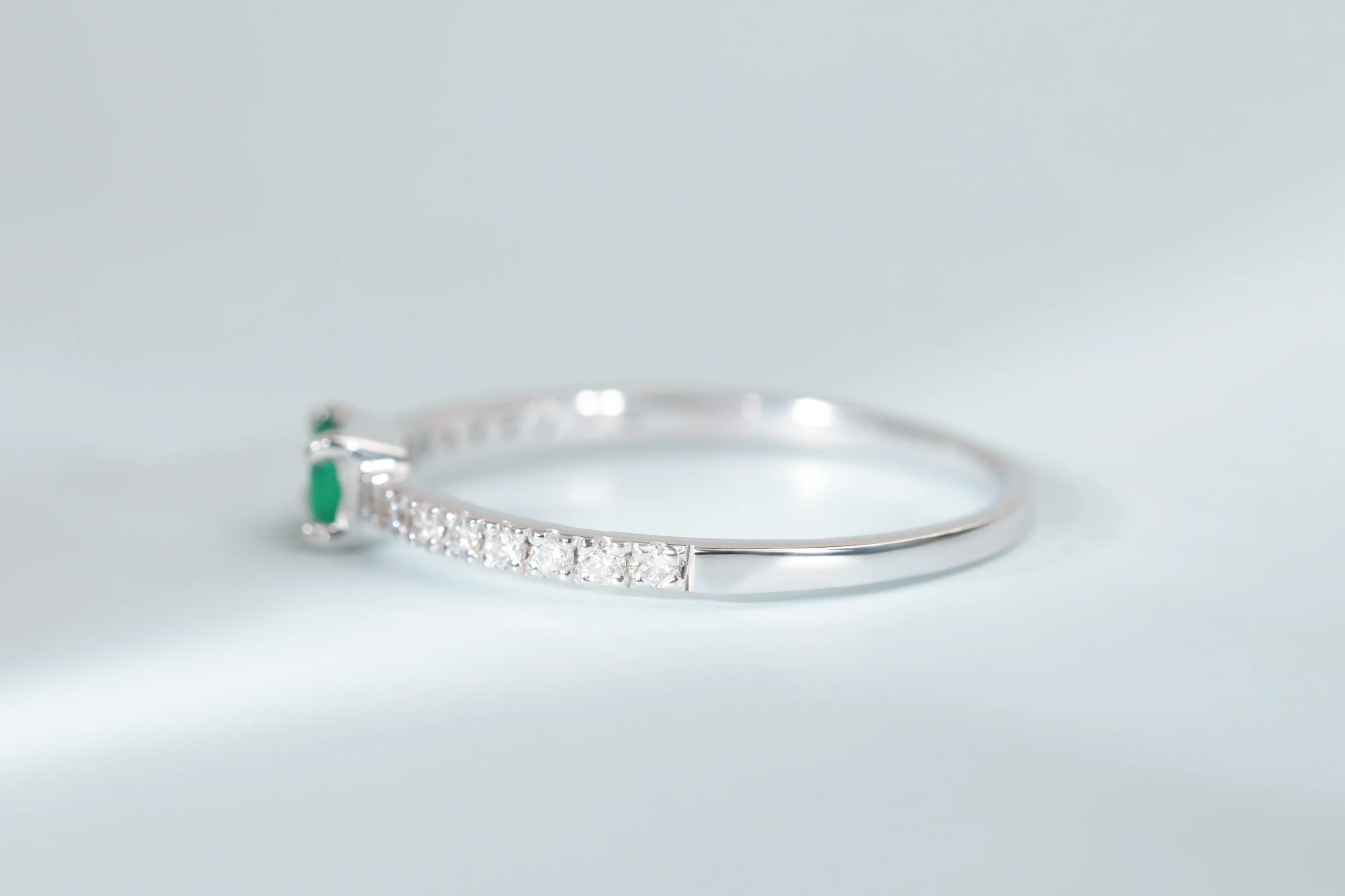 Кольцо из золота с 1 изумрудом весом 0,13 карат, цвет 5, чистота 5; 14 бриллиантами в огранке «круглая» весом 0,14 карат, цвет 4, чистота 5.