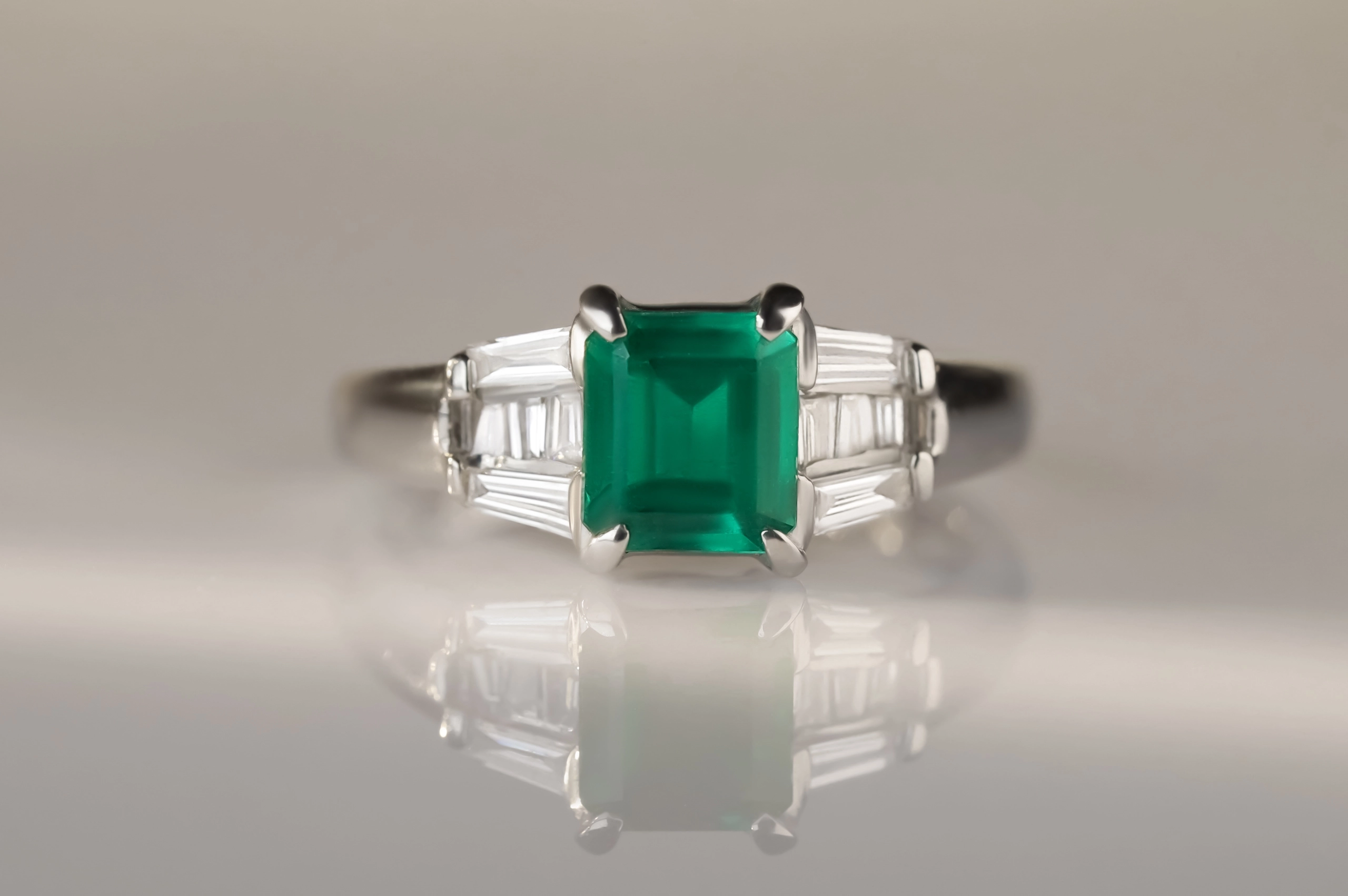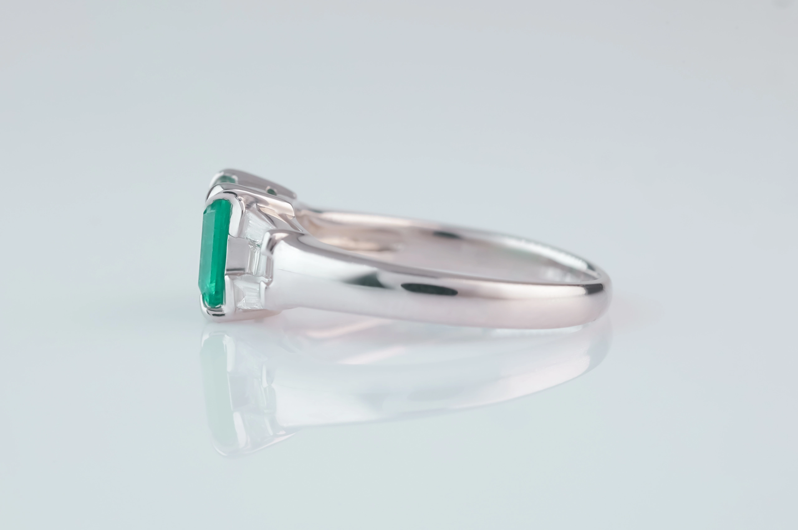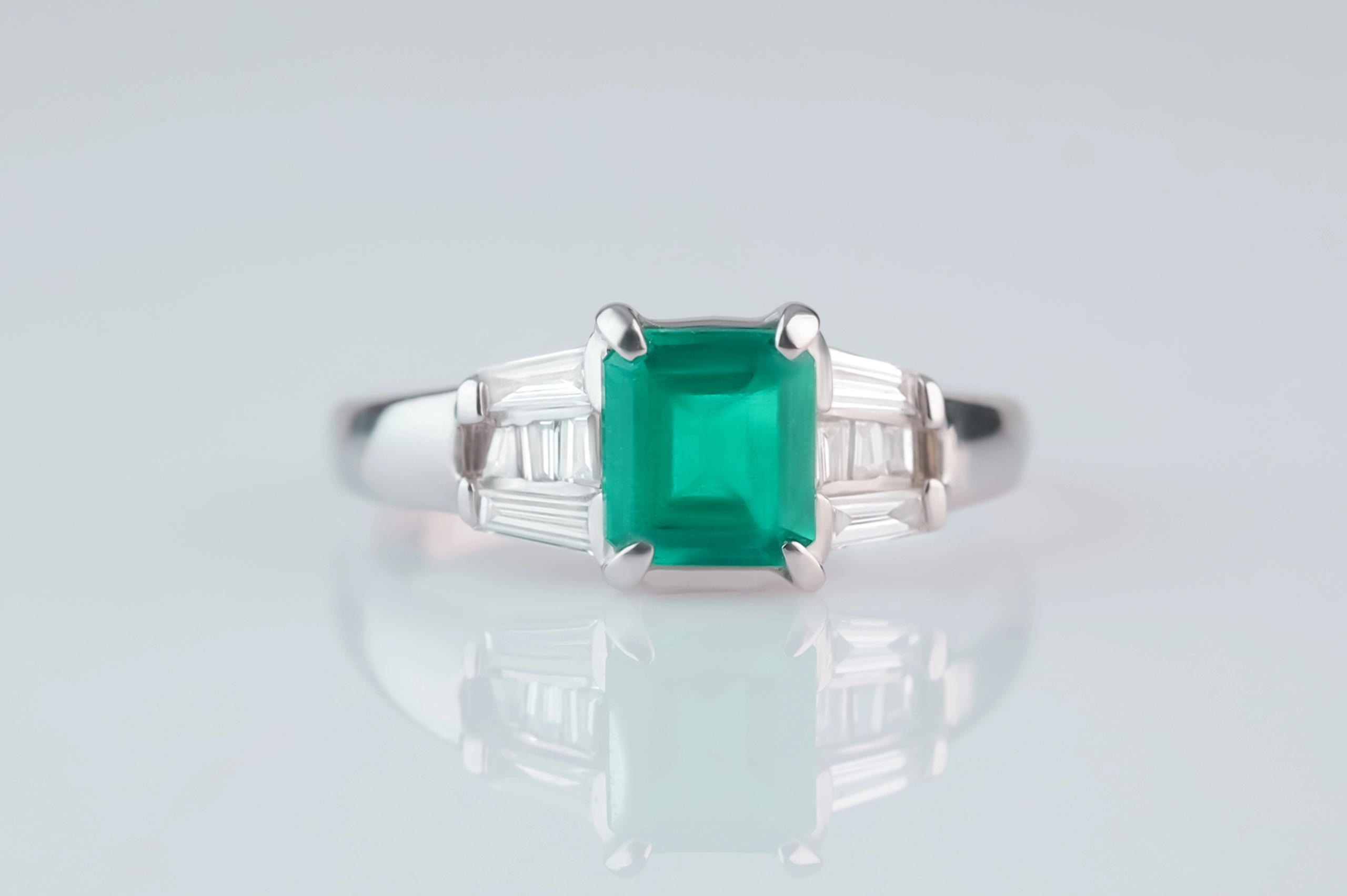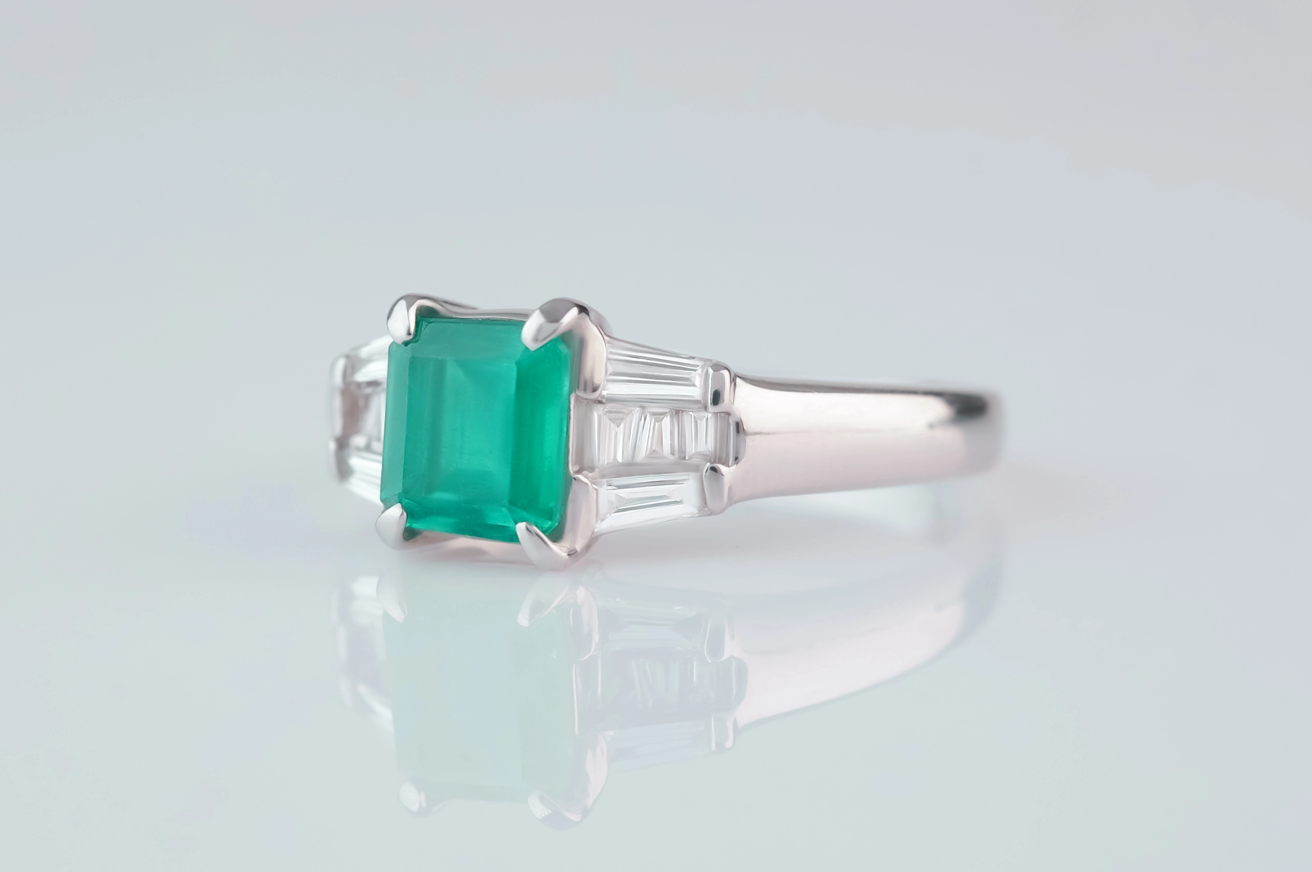 Кольцо из платины с 8 бриллиантами в огранке «багет» весом 0,26 карат, цвет 4, чистота 4; 1 изумрудом в огранке «квадрат» весом 0,88 карат, цвет 6, чистота 6.