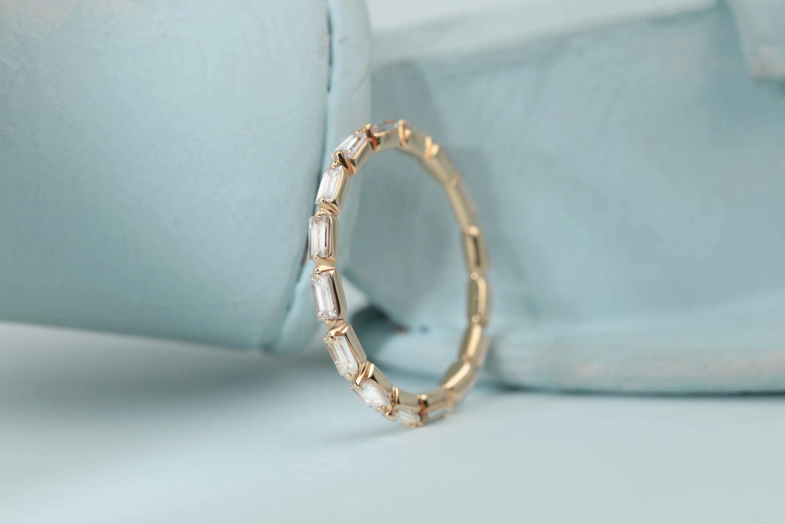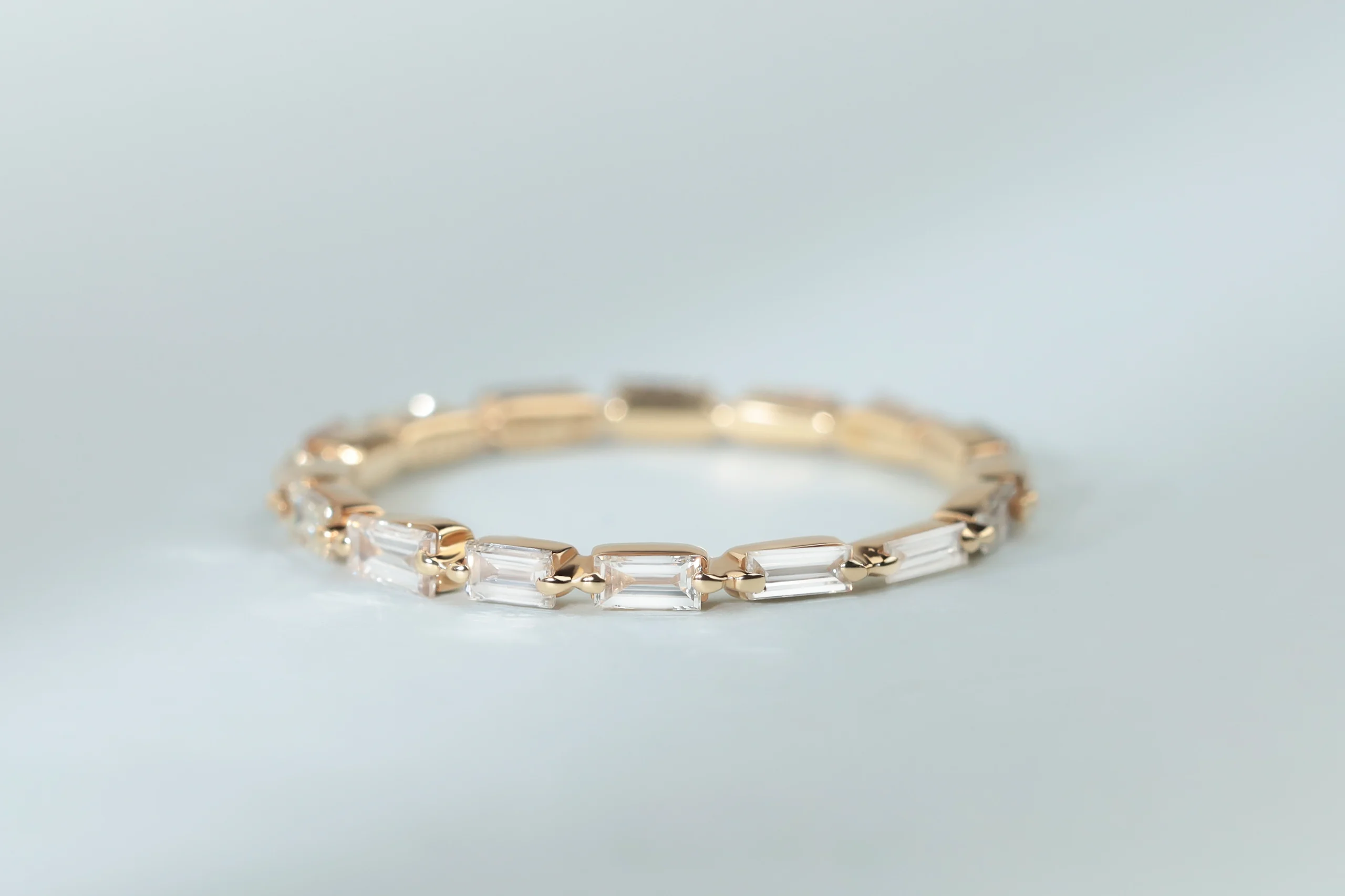 Золотое кольцо общим весом 1,17 гр с 16 бриллиантами в огранке «багет», 0,73 кт, цвет 4, чистота 5.