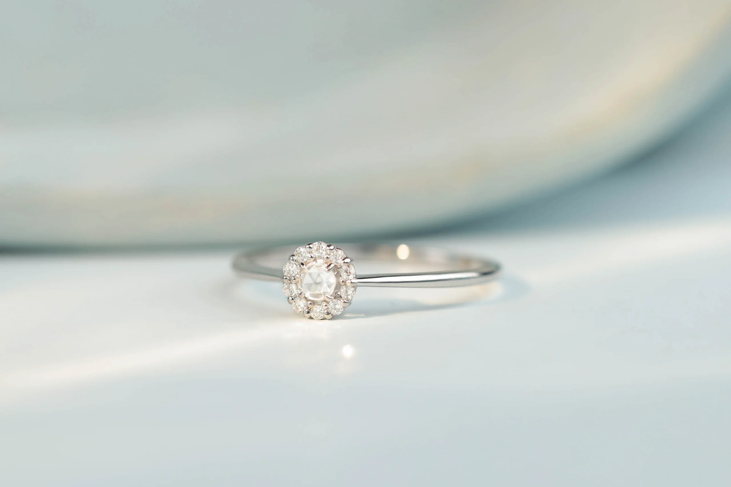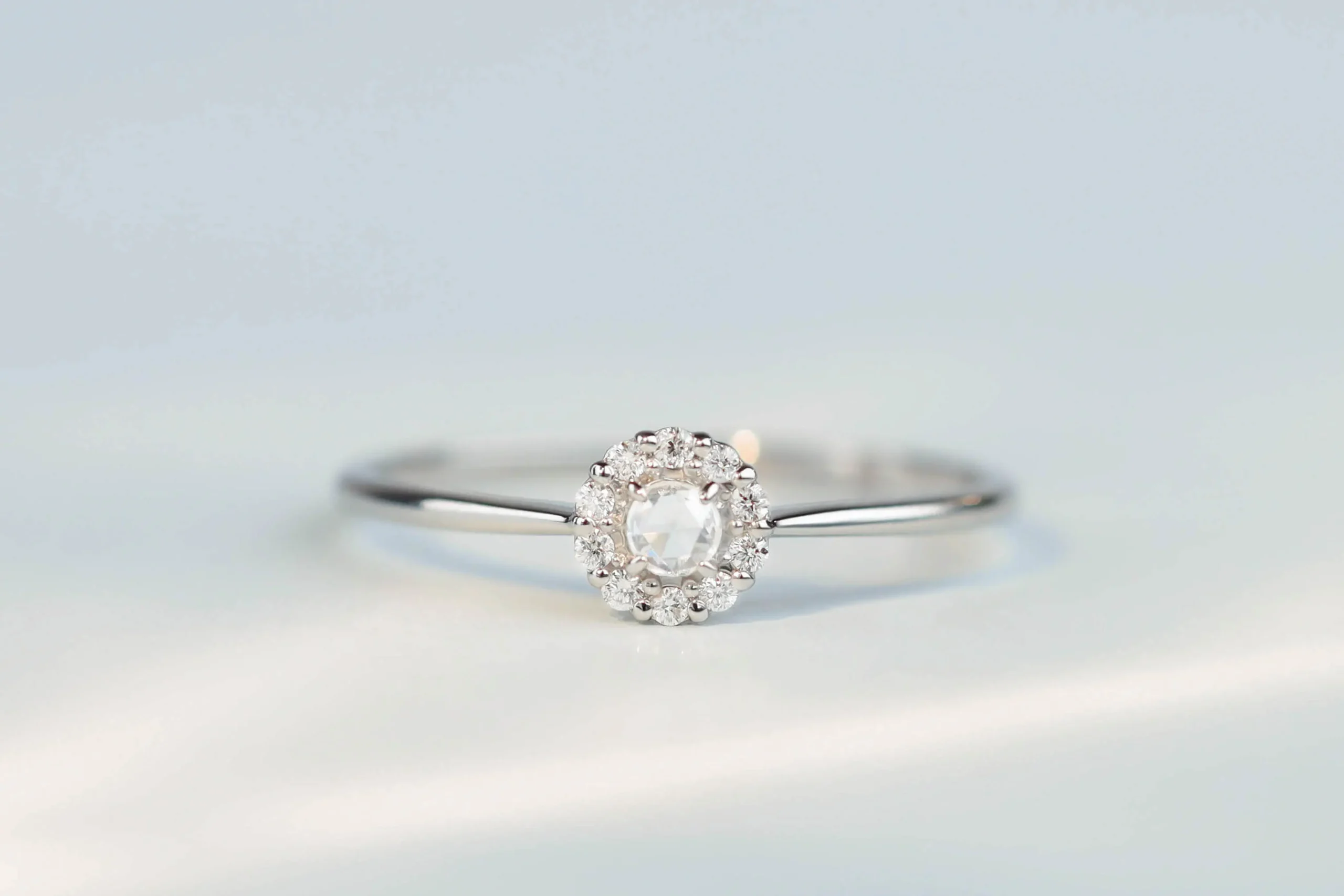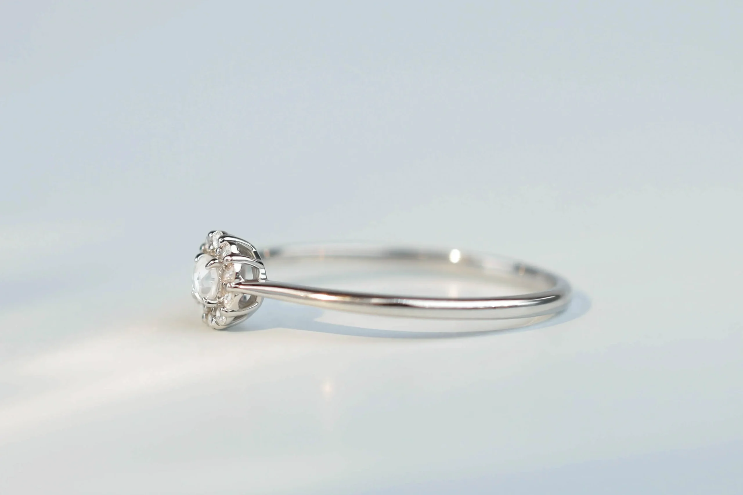 Кольцо из платины с 1 бриллиантом в огранке «роза» весом 0,03 карат, цвет 5, чистота 5; 10 бриллиантами в огранке «круглая» весом 0,05 карат, цвет 5, чистота 6.