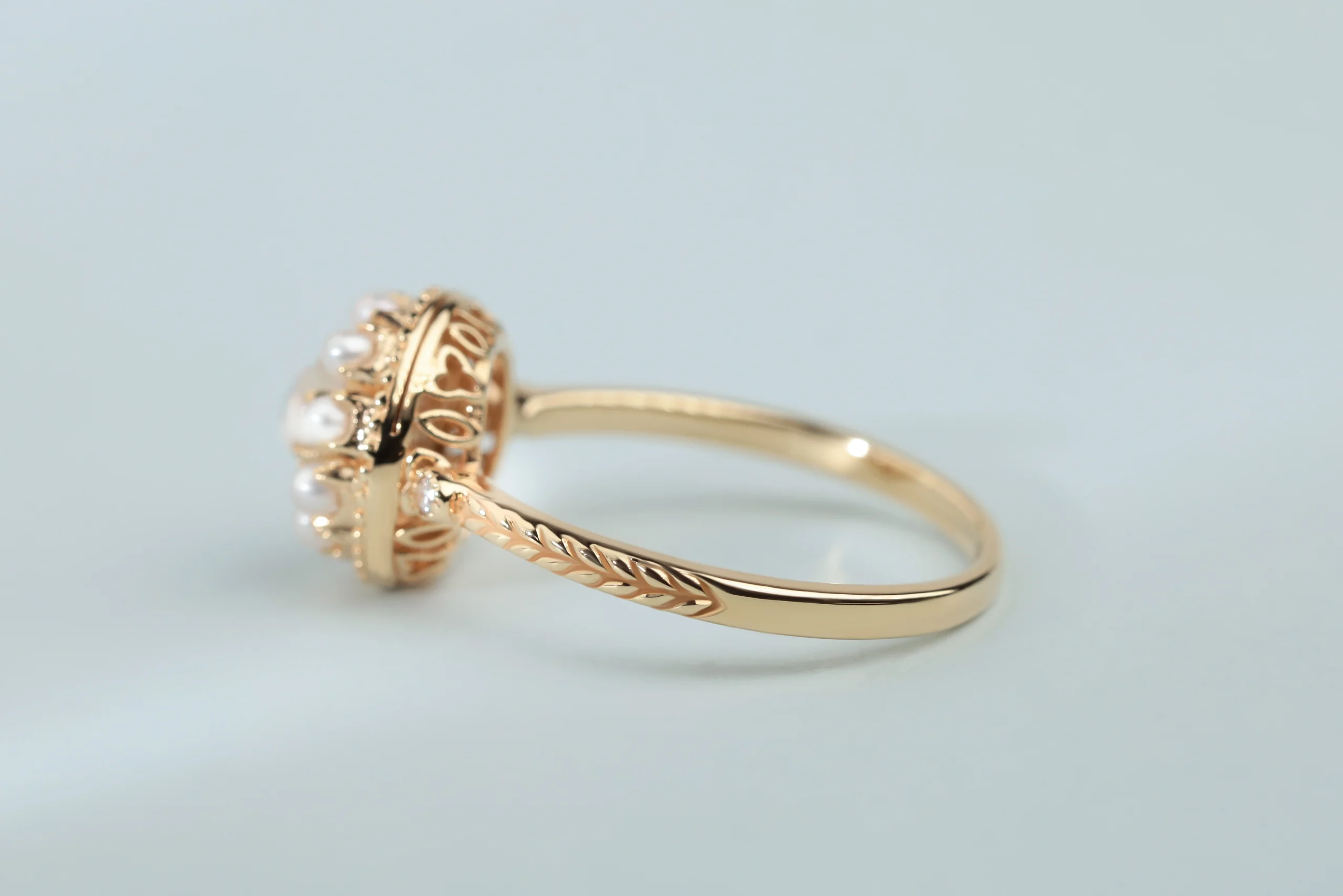 Золотое кольцо общим весом 3,19 гр с 1 опалом; 10 жемчужинами, 1,0 кт; 2 бриллиантами в огранке «круглая», 0,02 кт, цвет 3, чистота 5. Размер центральной части 12 х 12 мм.