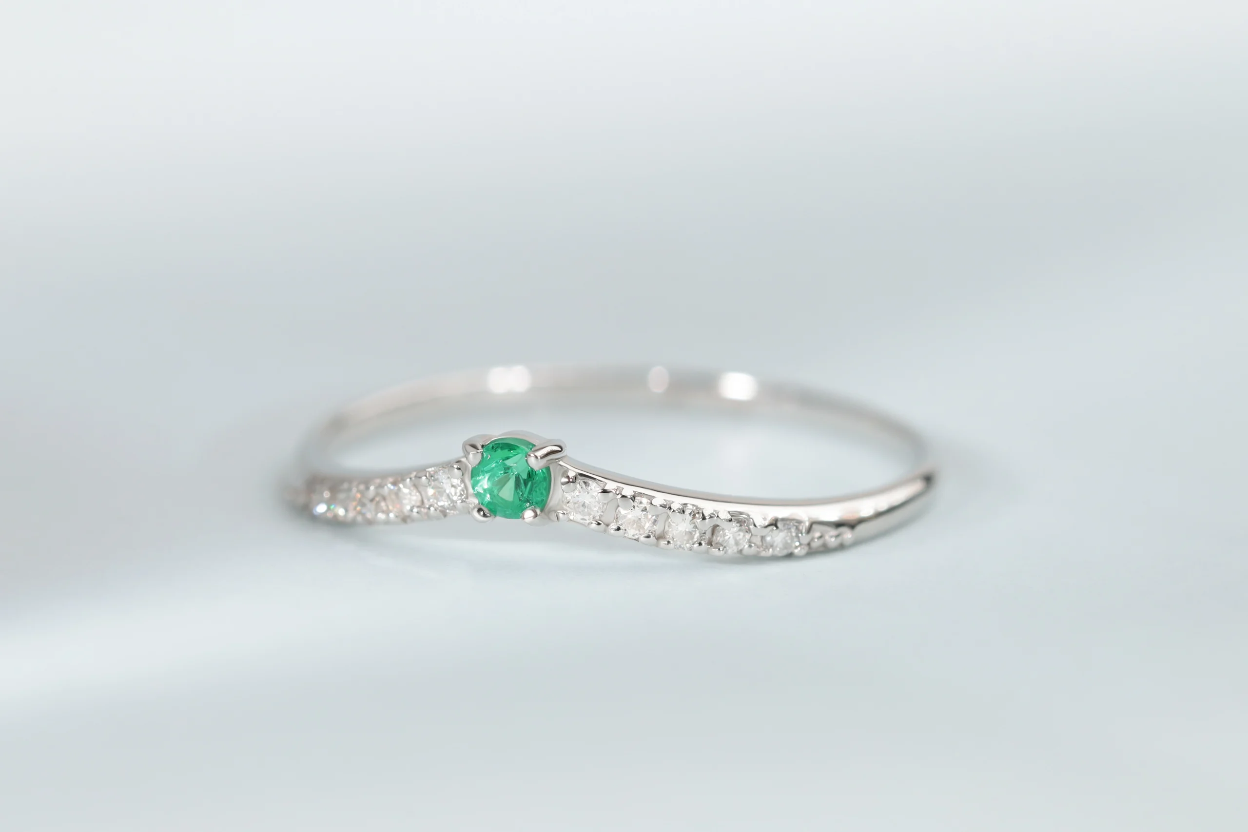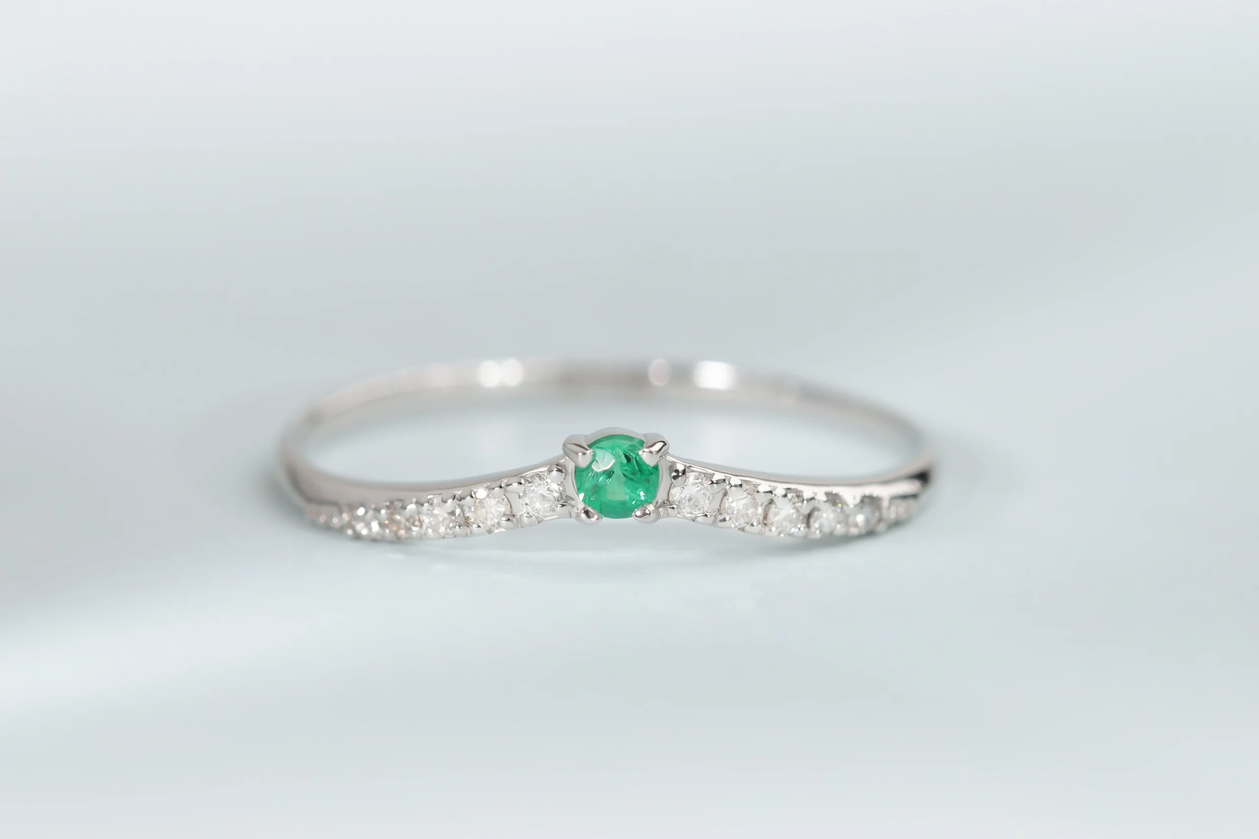 Кольцо из платины с 1 изумрудом в огранке «круглая» весом 0,03 карат, цвет 5, чистота 5; 10 бриллиантами в огранке «круглая» весом 0,06 карат, цвет 3, чистота 5.
