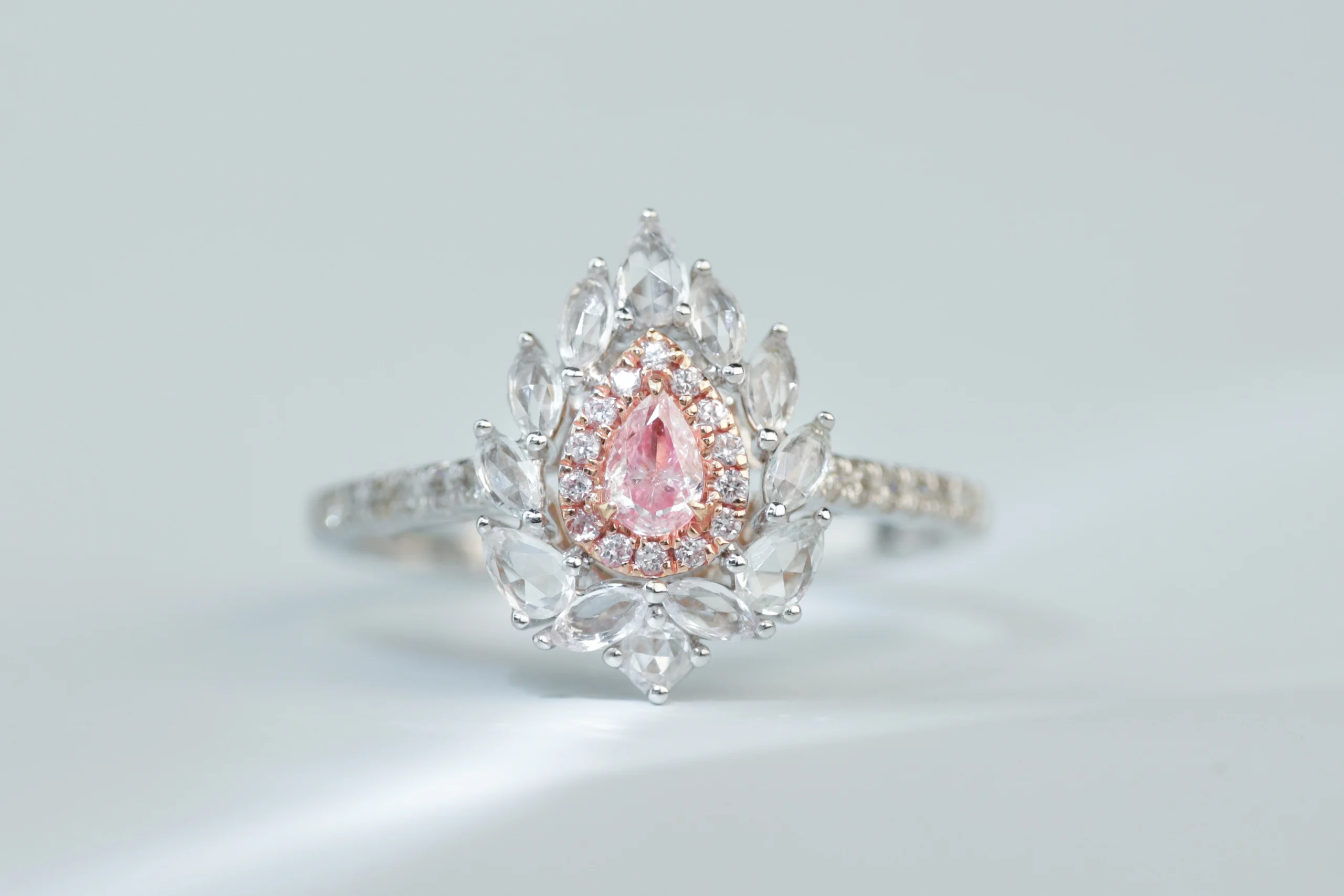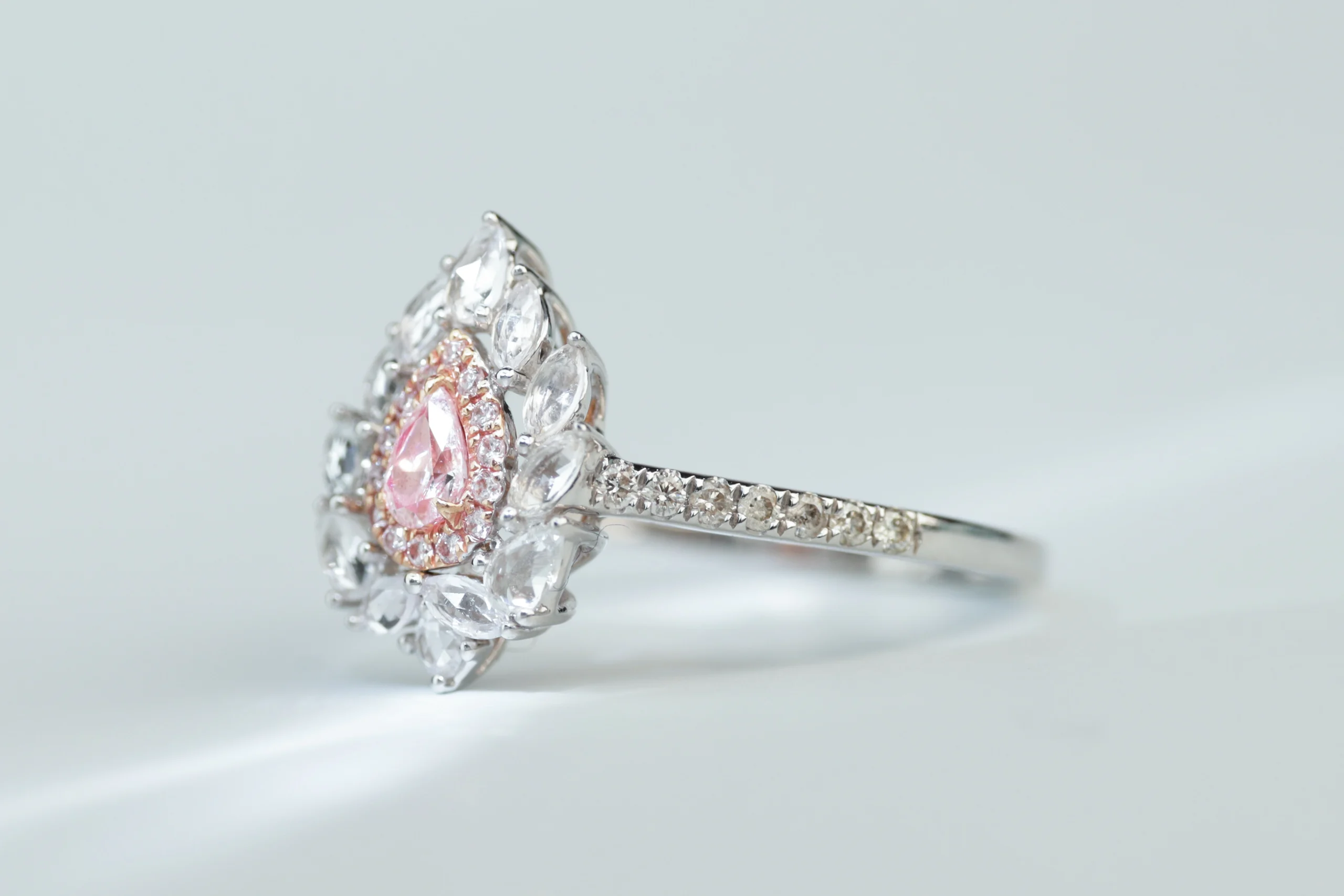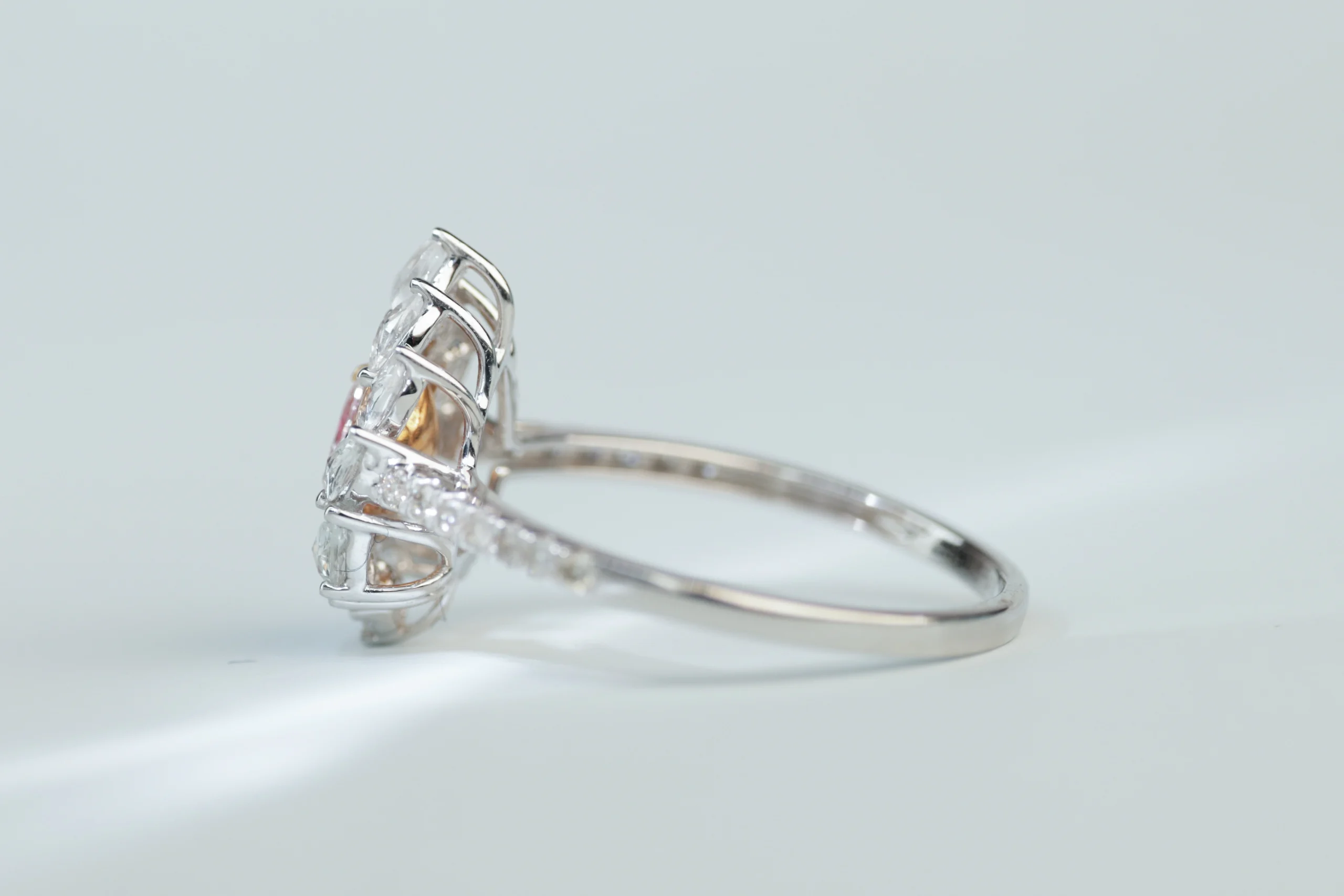 Золотое кольцо общим весом 2,22 гр с 1 розовыми бриллиантами в огранке «груша», 0,10 кт, цвет 6, чистота 6; 13 розовыми бриллиантами в огранке «круглая», 0,04 кт, цвет 6, чистота 5; 12 бриллиантами в огранке «маркиз», 0,20 кт, цвет 4, чистота 5. Размер центральной части 13 х 10 мм.
