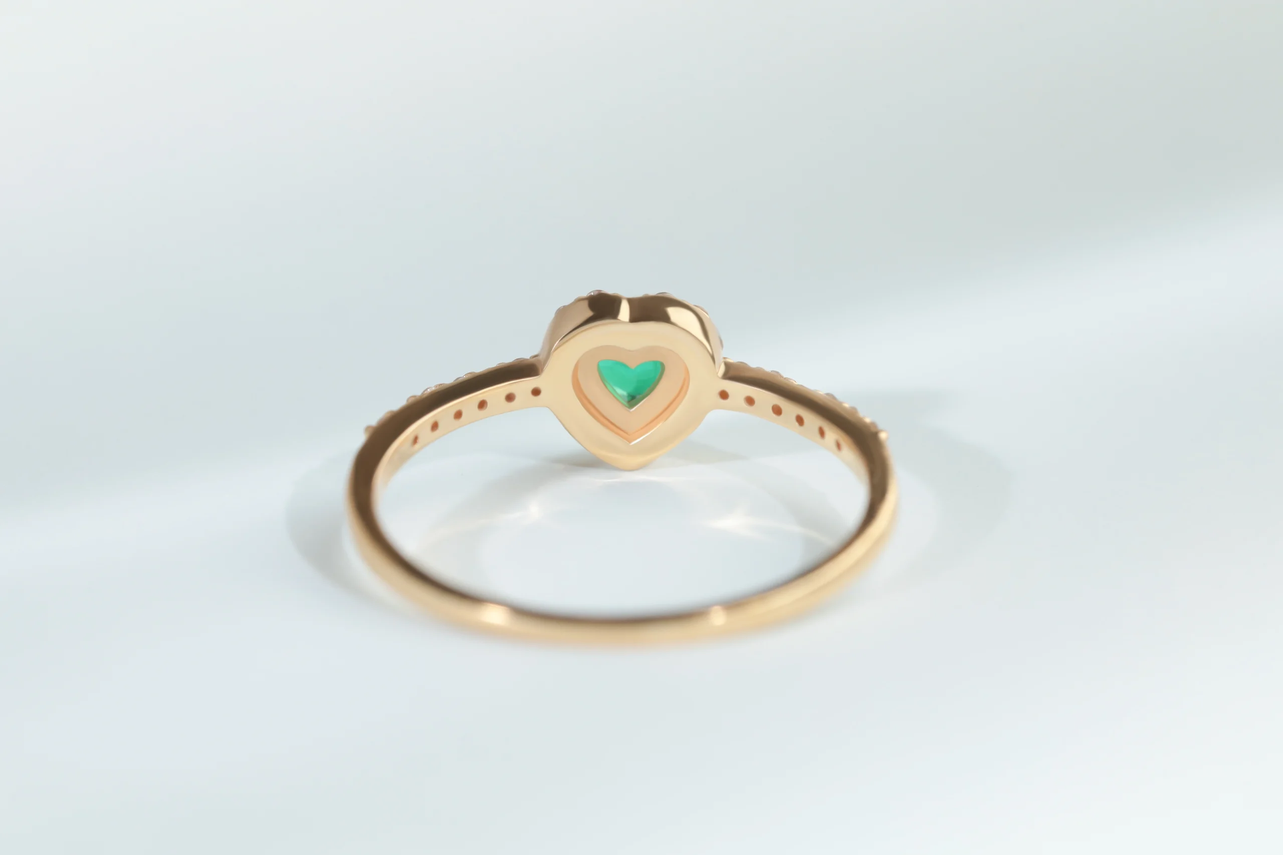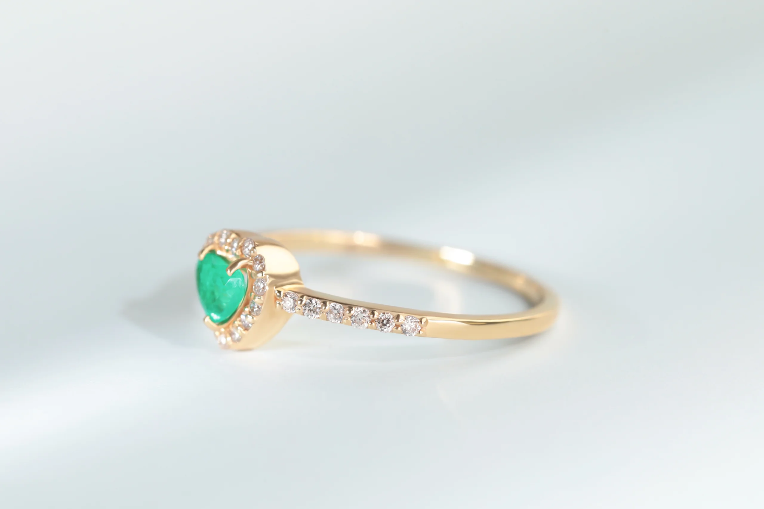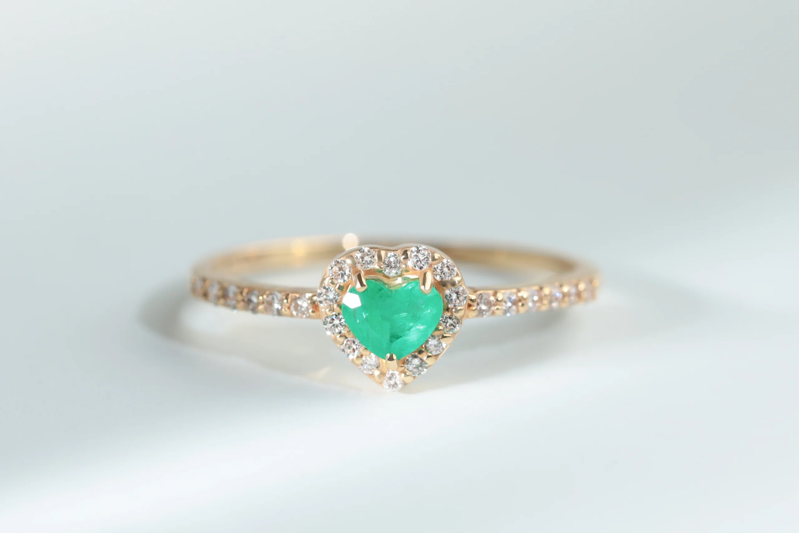 Кольцо из золота с 1 изумрудом в огранке «сердце» весом 0,18 карат, цвет 2, чистота 2; 27 бриллиантами в огранке «круглая» весом 0,13 карат, цвет 3, чистота 4.