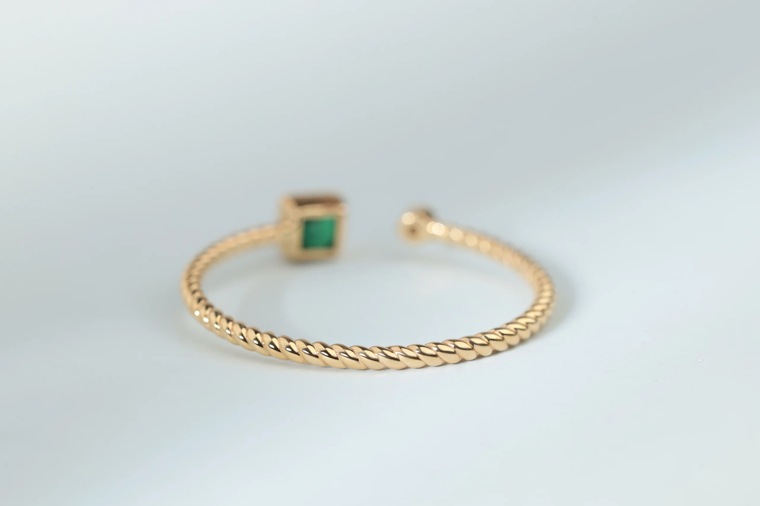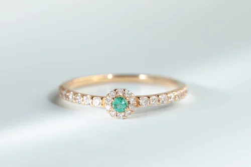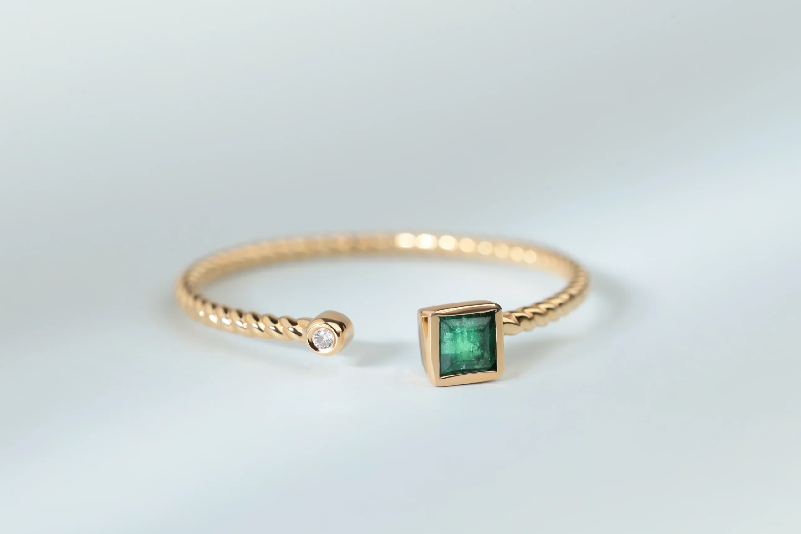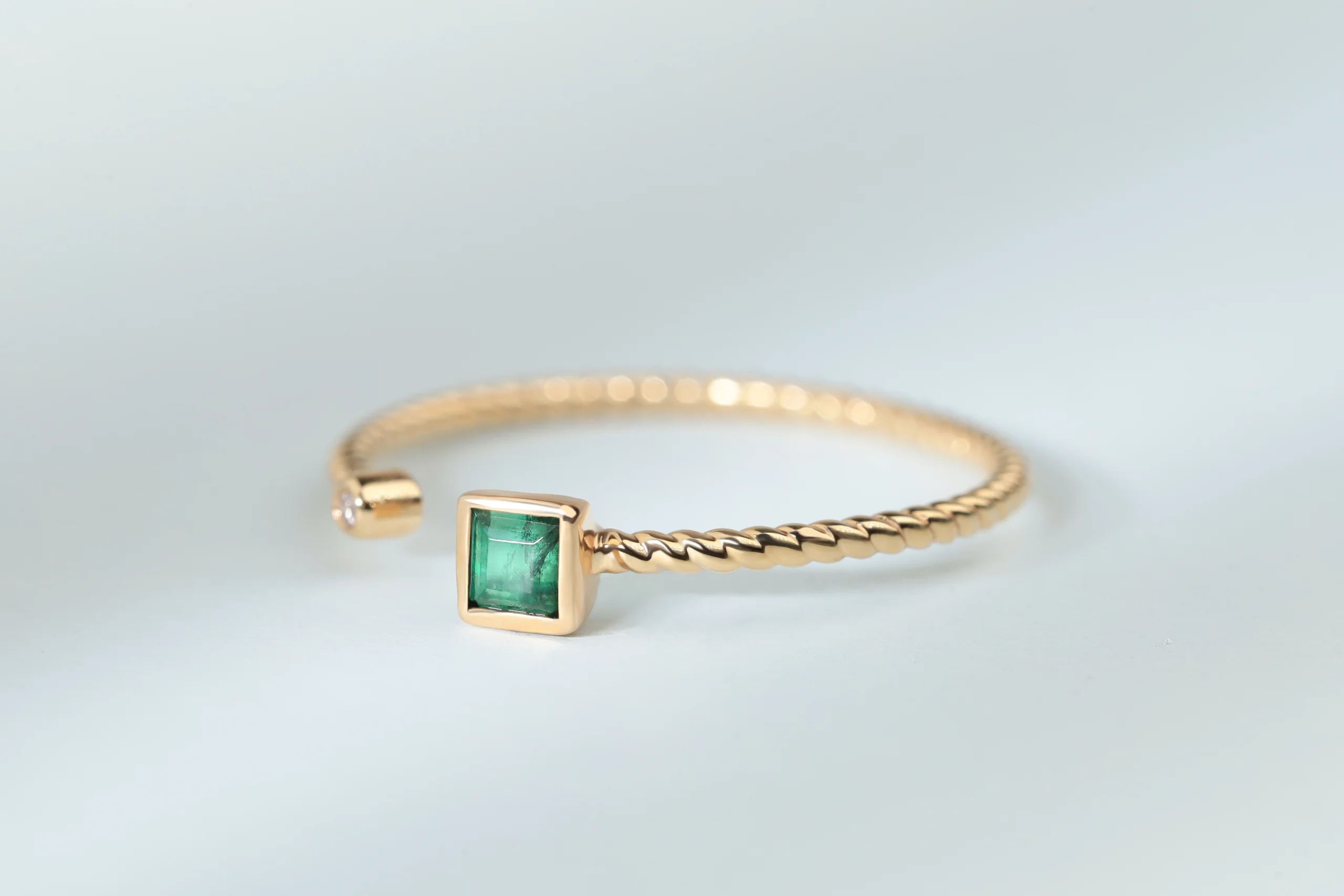 Кольцо из золота с 1 изумрудом в огранке «багет» весом 0,12 карат, цвет 2, чистота 2; 1 бриллиантом в огранке «круглая» весом 0,005 карат, цвет 4, чистота 5.