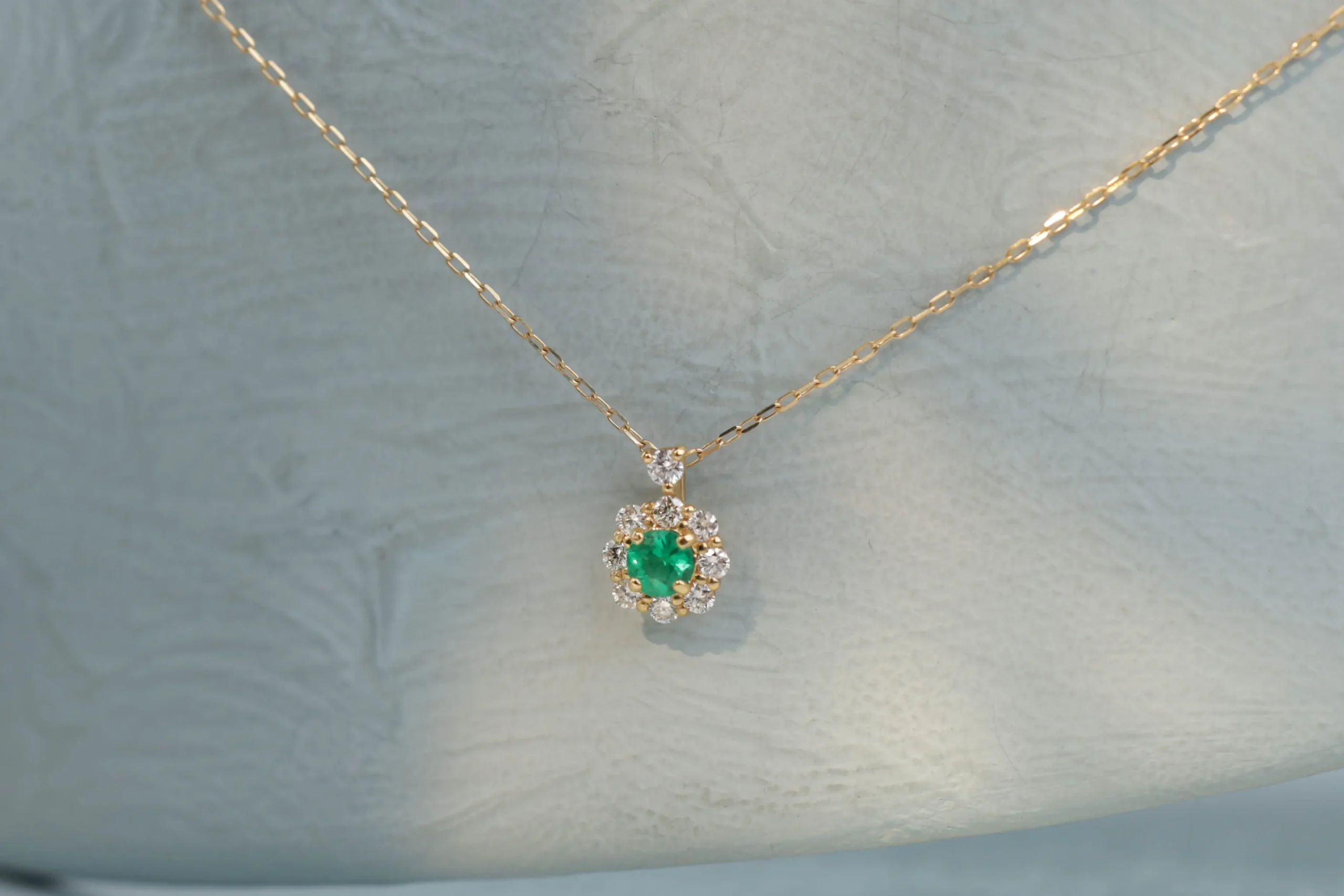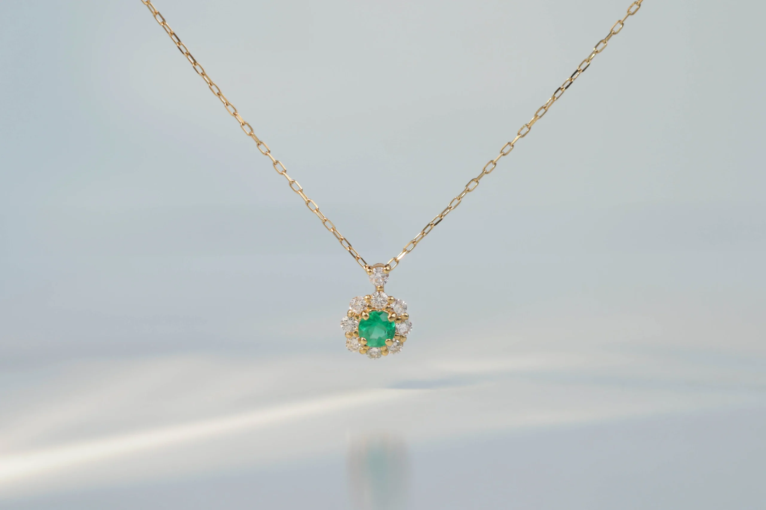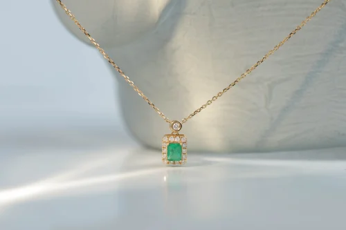Колье из золота с 1 изумрудом весом 0,21 карат, цвет 3, чистота 3; 15 бриллиантами огранки «круглая» весом 0,08 карат, цвет 3, чистота 5.