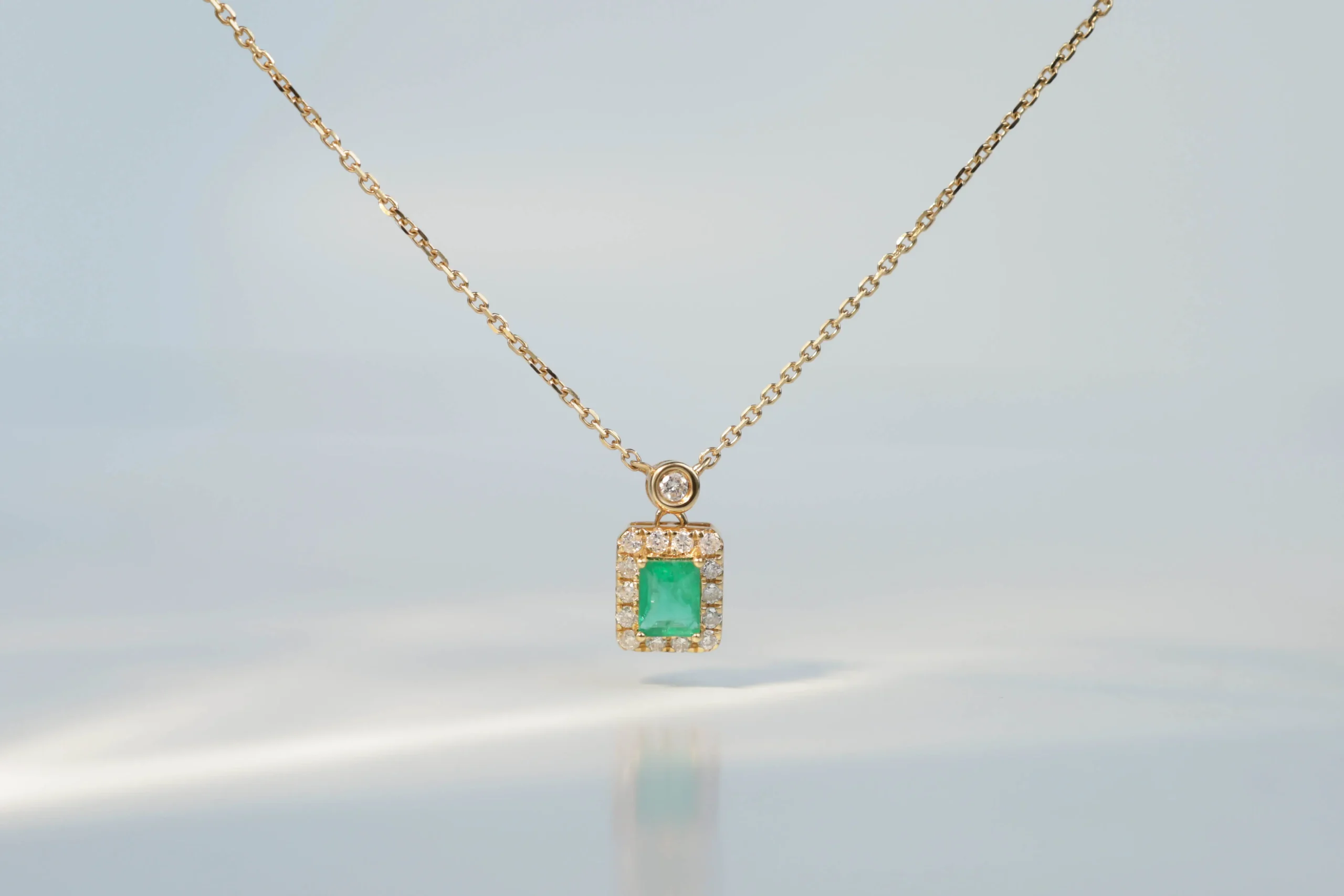 Колье из золота с 1 изумрудом весом 0,21 карат, цвет 3, чистота 3; 15 бриллиантами в огранке «круглая» весом 0,08 карат, цвет 3, чистота 5.