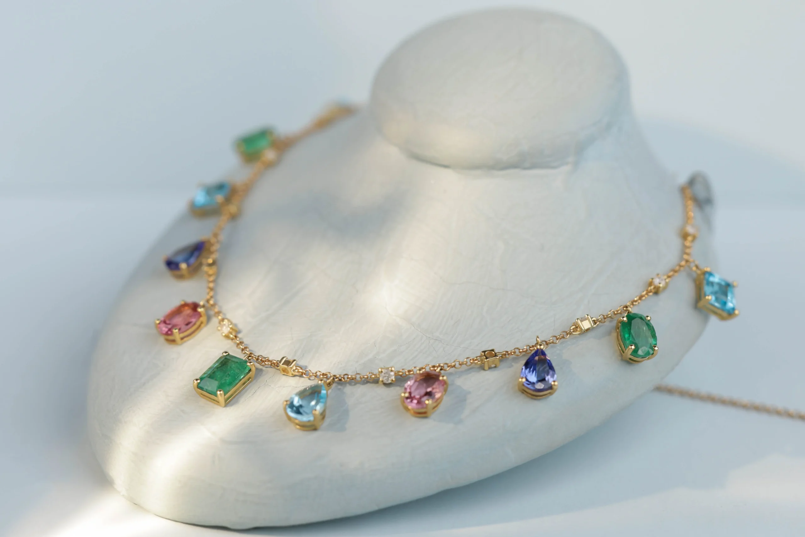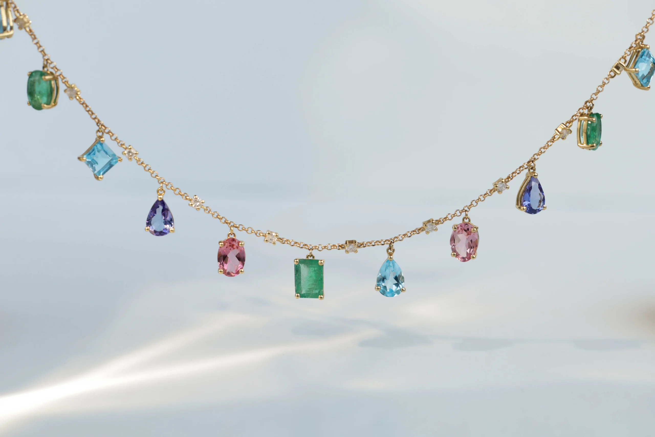 Колье с бриллиантами, изумрудом, топазом, турмалином и танзанитом