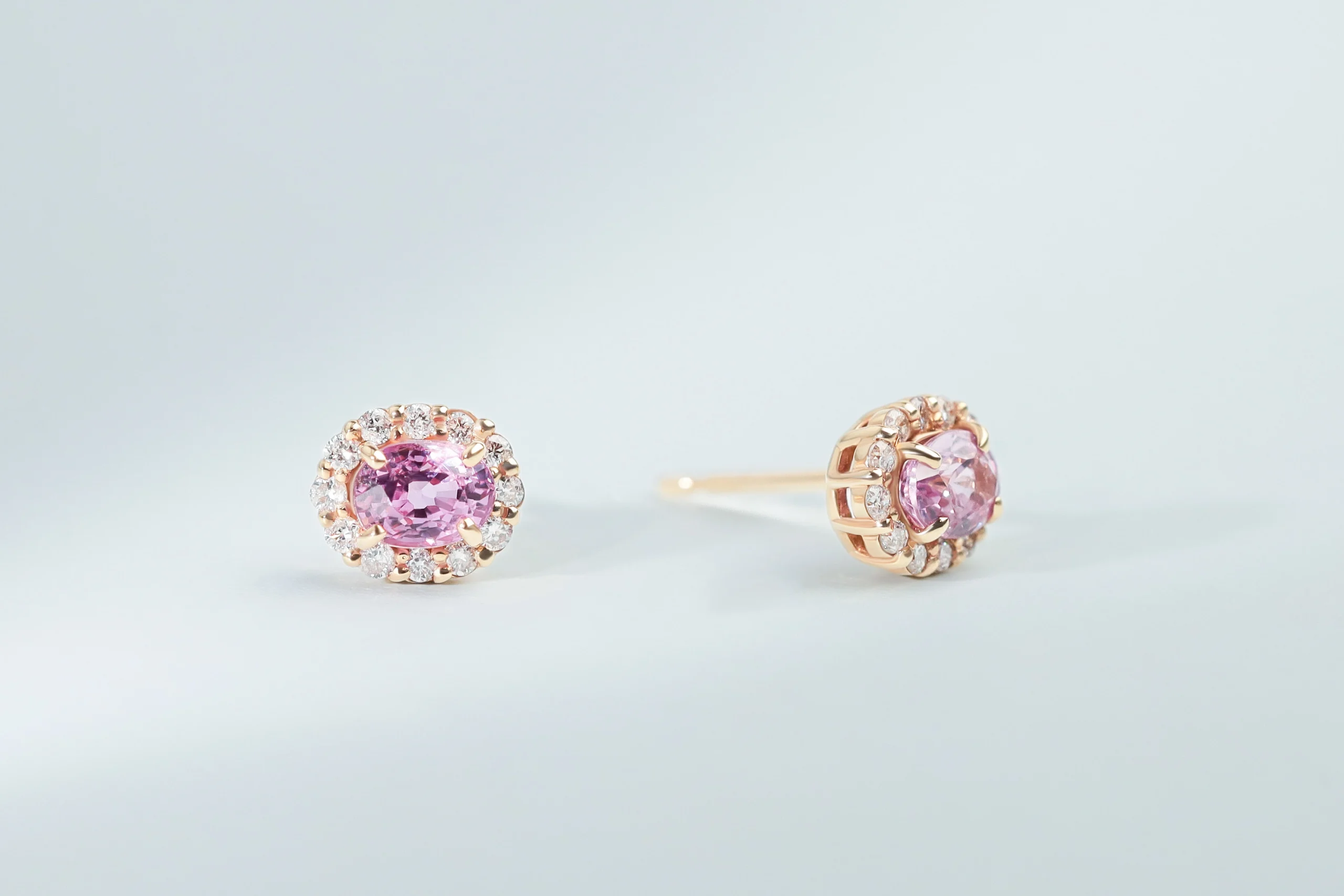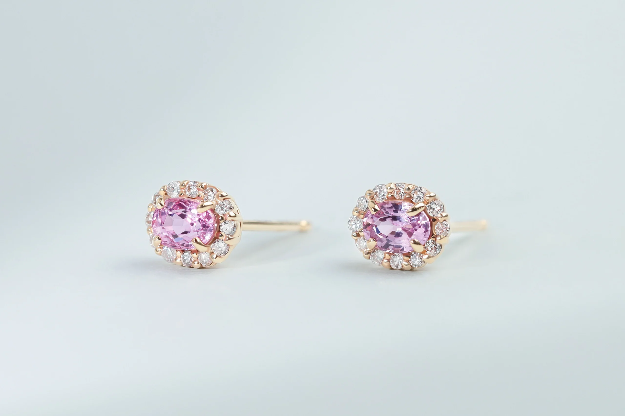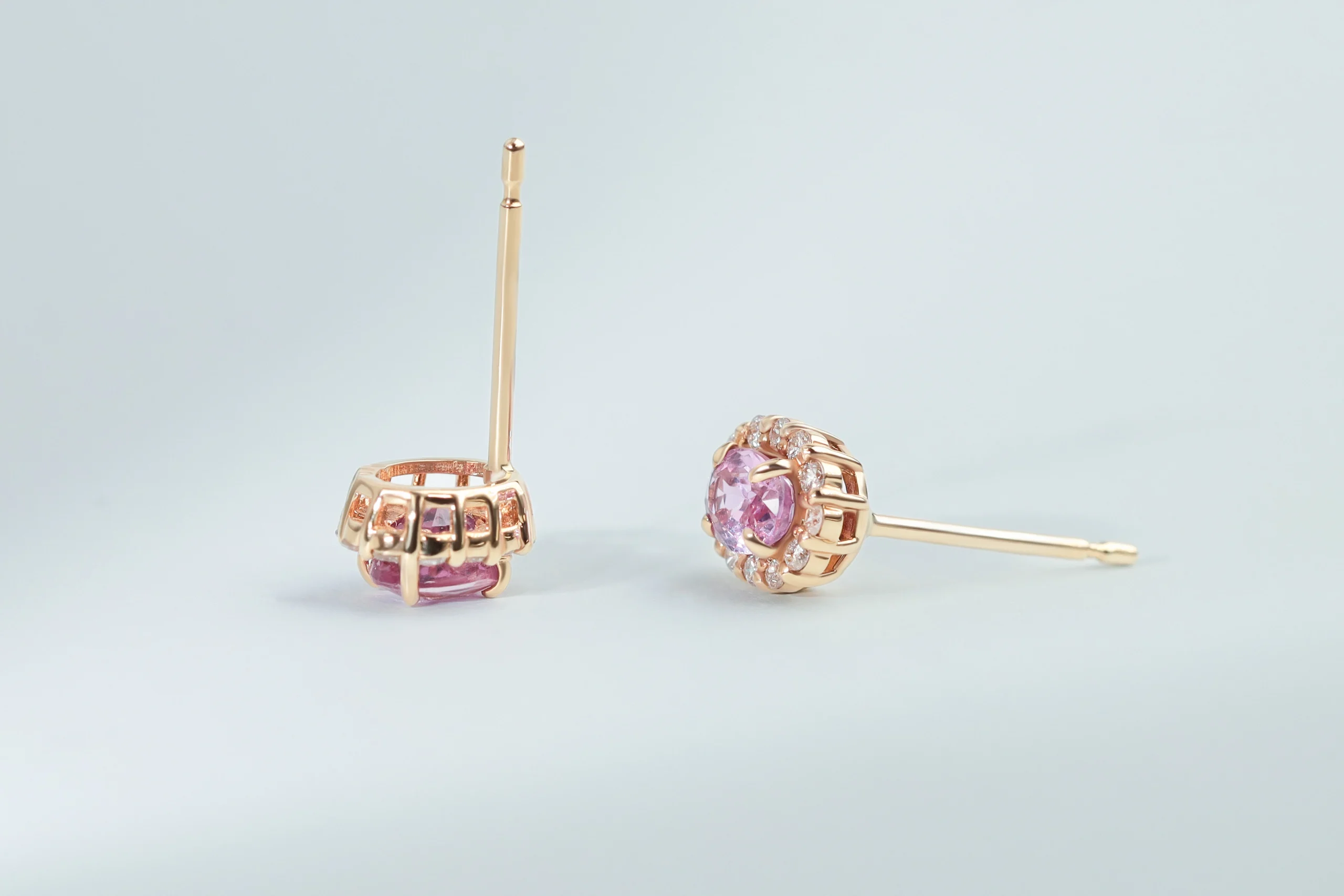 Серьги с 2 розовыми сапфирами весом 0,20 карат, цвет 3, чистота 3; 24 бриллиантами в огранке «круглая» весом 0,05 карат, цвет 3, чистота 4. Размер изделия 6 x 5 мм.